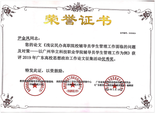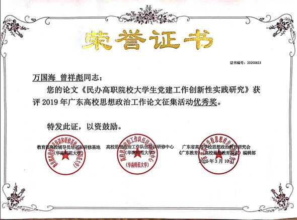 为提升高校思想政治工作队伍理论素养,促进科学研究,广东省高校思想政治工作队伍培训研修中心开展了2019年度高校思想政治工作优秀论文征集活动,我院教师积极投稿响应。经评审组评审,我院教师喜获2项荣誉,分别是尹金凤老师的论文《浅议民办高职院校辅导员学生管理工作面临的问题及对策》和万国海、曾祥彪老师的论文《民办高职院校大学生党建工作创新性实践研究》均获高校思政工作论文优秀奖。