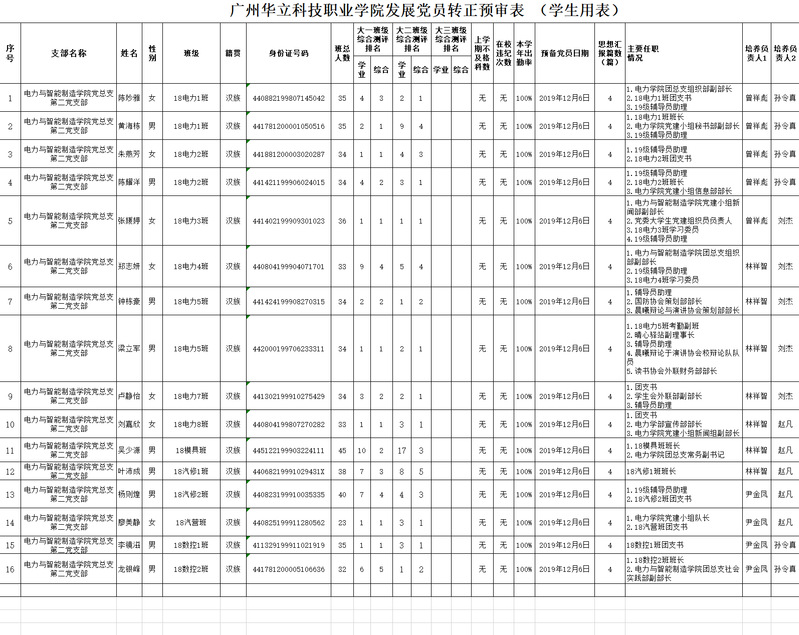 根据《中国共产党章程》、《中国共产党发展党员工作细则》和党内有关规定,经本人申请,支部考察,组织预审,拟于近期召开支部大会讨论陈妙雅等16名预备党员转正事宜。现将基本情况予以公示: