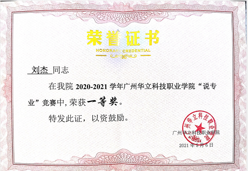 2020-2021学年广州华立科技职业学院“说专业”竞赛在2021年4月28日正式落下帷幕,8个二级学院选送的参赛老师,参加了这次别开生面的比赛。本次比赛教务处组织牵头,由马龙海执行校长担任评审组组长,学校领导专家、二级学院院长以及职能部门负责人等组成评审团,对赛事进行了专业而严谨的评审工作。最终经过公正严谨的成绩统计,我院刘杰老师获得“说专业”竞赛一等奖。