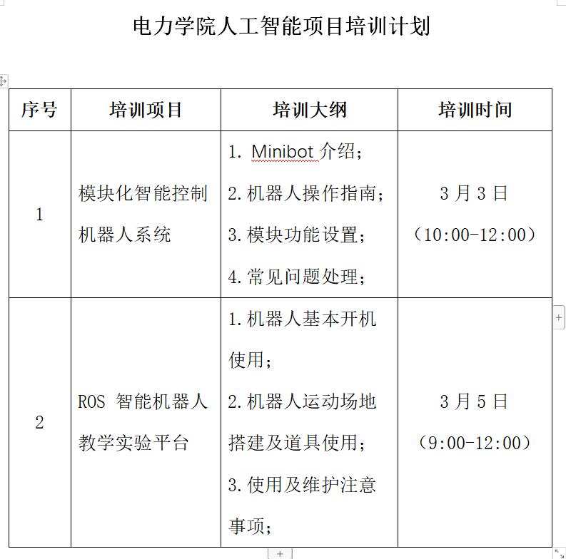 2021年3月3号上午、3月5号上午电力学院将组织设备供应商在科技楼5楼进行模块化智能控制机器人系统、ROS 智能机器人教学实验平台的设备培训,请电力系、机械系老师按时参加,培训计划见下表: