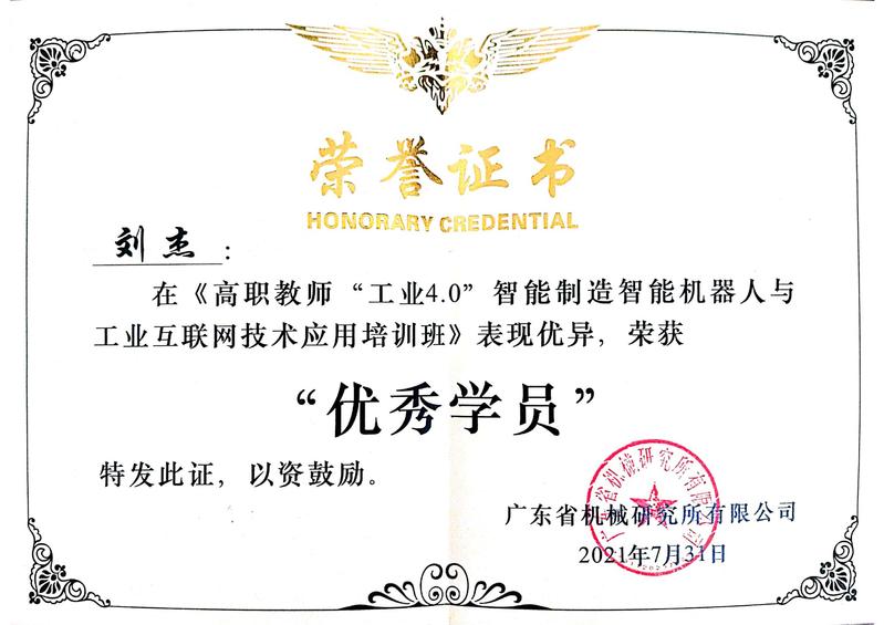 通过此次培训,两位教师对智能制造智能机器人和工业互联网技术技能提升、把握职业教育方向,促进专业升级、课程开发、1+X证书等方面都有了一定的收获,其中刘杰老师获得“优秀学员”,林祥智老师获得“学习之星”。