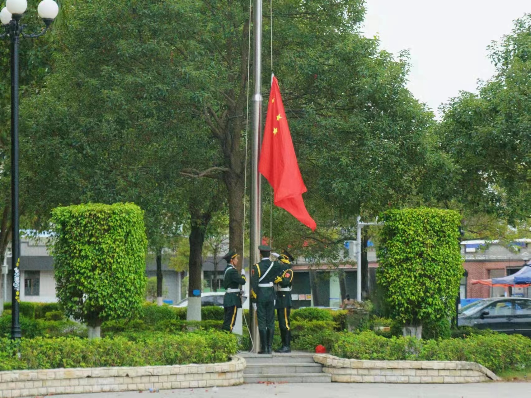 随着《义勇军进行曲》的响起,五星红旗在微风中冉冉升起。在场学生庄严肃穆,以饱满的精神状态向祖国致敬。