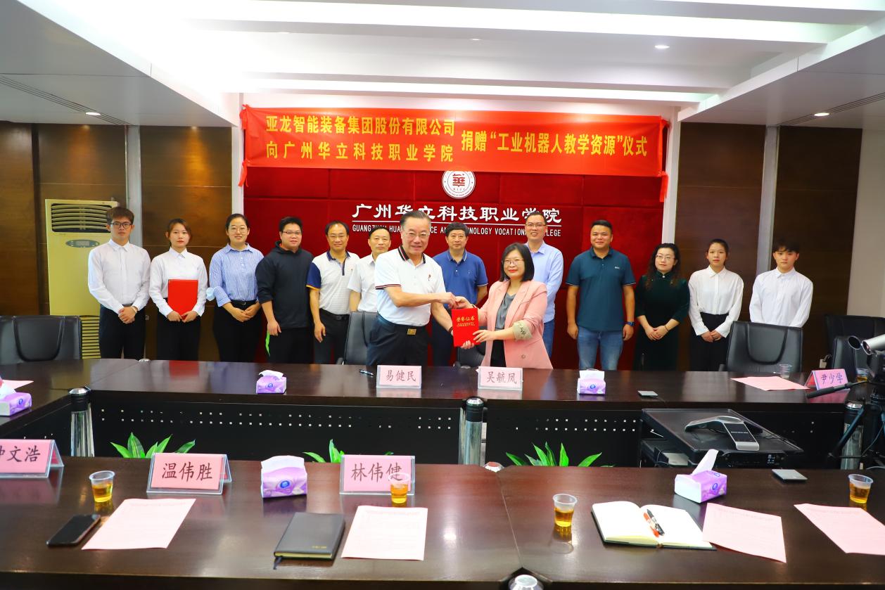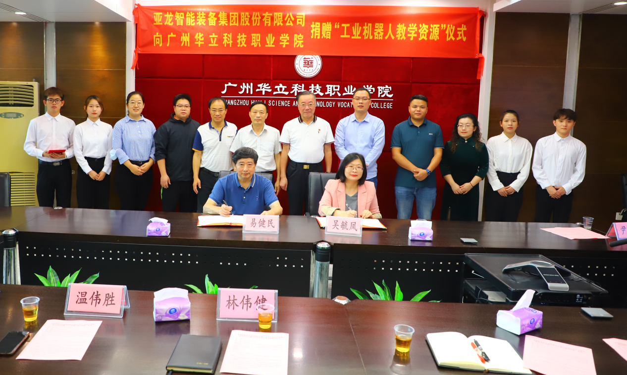 5月15日上午,亚龙智能装备集团股份有限公司向广州华立科技职业学院捐赠“工业机器人教学资源”仪式在行政楼305举行。亚龙智能装备集团股份有限公司广东分公司吴毓凤总经理、李志文经理、尹少学经理、广州华立科技职业学院校长易健民教授、党委书记林伟健教授、科研处温伟胜处长、校外教学与就业处钟文浩处长、电力与智能制造学院王秀敏院长、学校产教融合办公室陈茜副主任参加捐赠仪式。捐赠仪式由王秀敏院长主持。