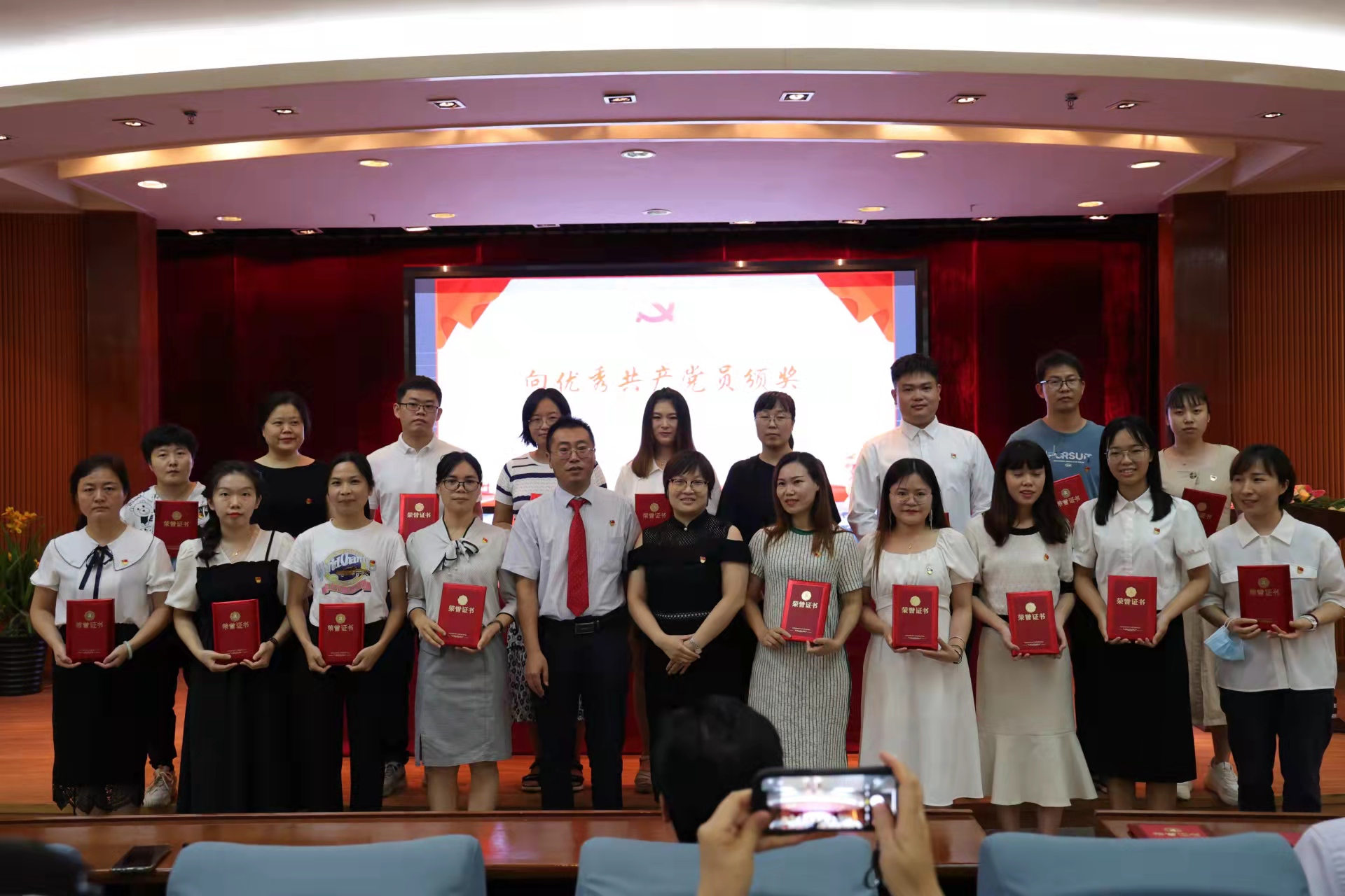 学校领导为先进基层党组织、优秀党务工作者、 优秀共产党员、“学习强国”学习标兵进行表彰颁发聘书。