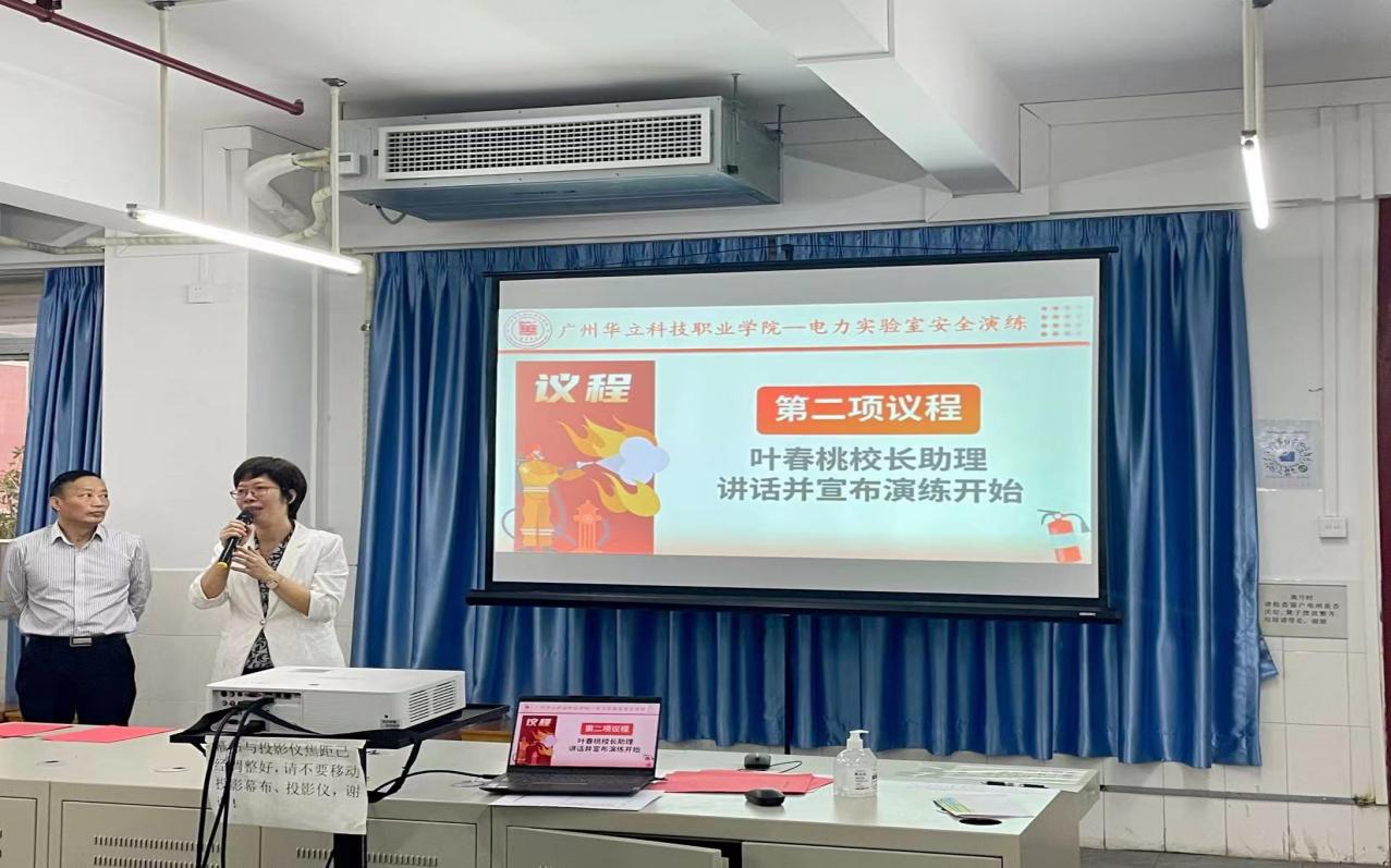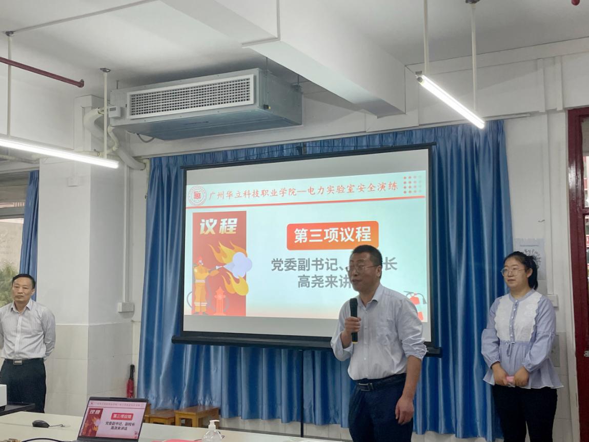 为了贯彻落实“预防为主,防消结合”的方针,确保电力实验室的安全性,避免发生实验过程出错而引起火灾,增强实验室安全管理应急水平,进一步强化师生的安全意识。2023年3月24日,由实验实训中心主办电力与智能制造学院承办的电力实验室安全演练在综合楼508举行。学校党委书记陈良声、党委副书记、副校长高尧来、校长助理叶春桃、电力与智能制造学院院长王秀敏、实训中心主任张磊、学生处处长宋海泉、总务处处长李桂林、保卫处处长陈胜军、电力与智能制造学院党总支书记孙令真以及教师代表和学生代表出席了本次演练,本次演练由电力与智能制造学院刘杰、林祥智两位老师主持。