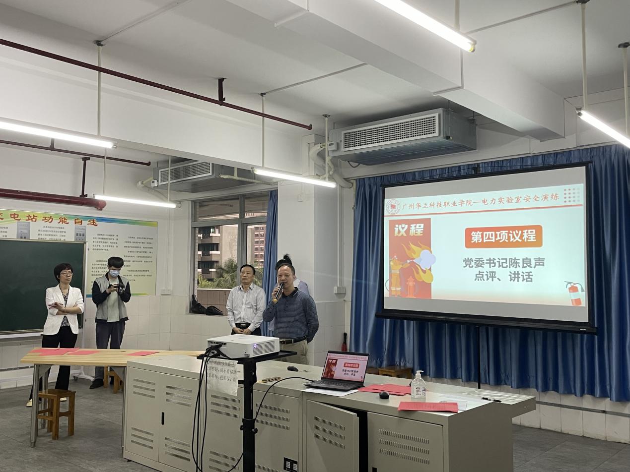 学校党委书记陈良声对本次电力实验室安全演练进行总结讲话。陈良声书记指出要切实加强校园安全管理,要把安全稳定作为最大的政治责任,妥善处理各种风险隐患,以安全稳定的教育生态安亿万心、稳千万家。学校安全事关师生生命财产、事关家庭幸福安康、事关学校科学发展、事关社会和谐稳定、事关国家长治久安。希望学校各部门、各单位树立安全发展理念,弘扬生命至上、安全第一思想,努力做到人人讲安全、事事为安全、时时想安全、处处要安全,凝神聚力建设更高水平的安全文明校园,共同为全校师生的学习工作生活、为学校的高质量发展营造平安祥和的校园环境。