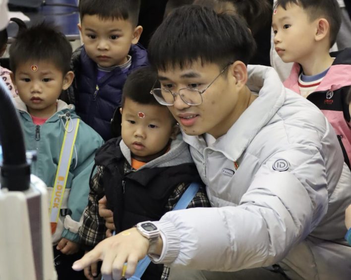 在科技楼5楼的科技馆,刘杰老师带着小朋友们了解无人机的分类、作用以及操作原理。张宁波老师带领小朋友们参观了智能控制机器人,与孩子们互动问答,为孩子们科普了工业机器人技术知识,让孩子们近距离了解工业机器人的结构,对看似神秘的机器人工作原理有了启蒙认知。