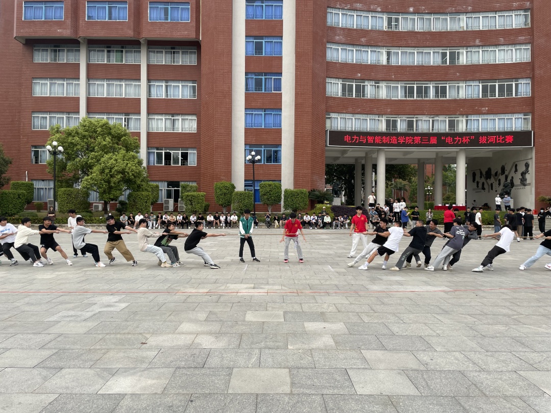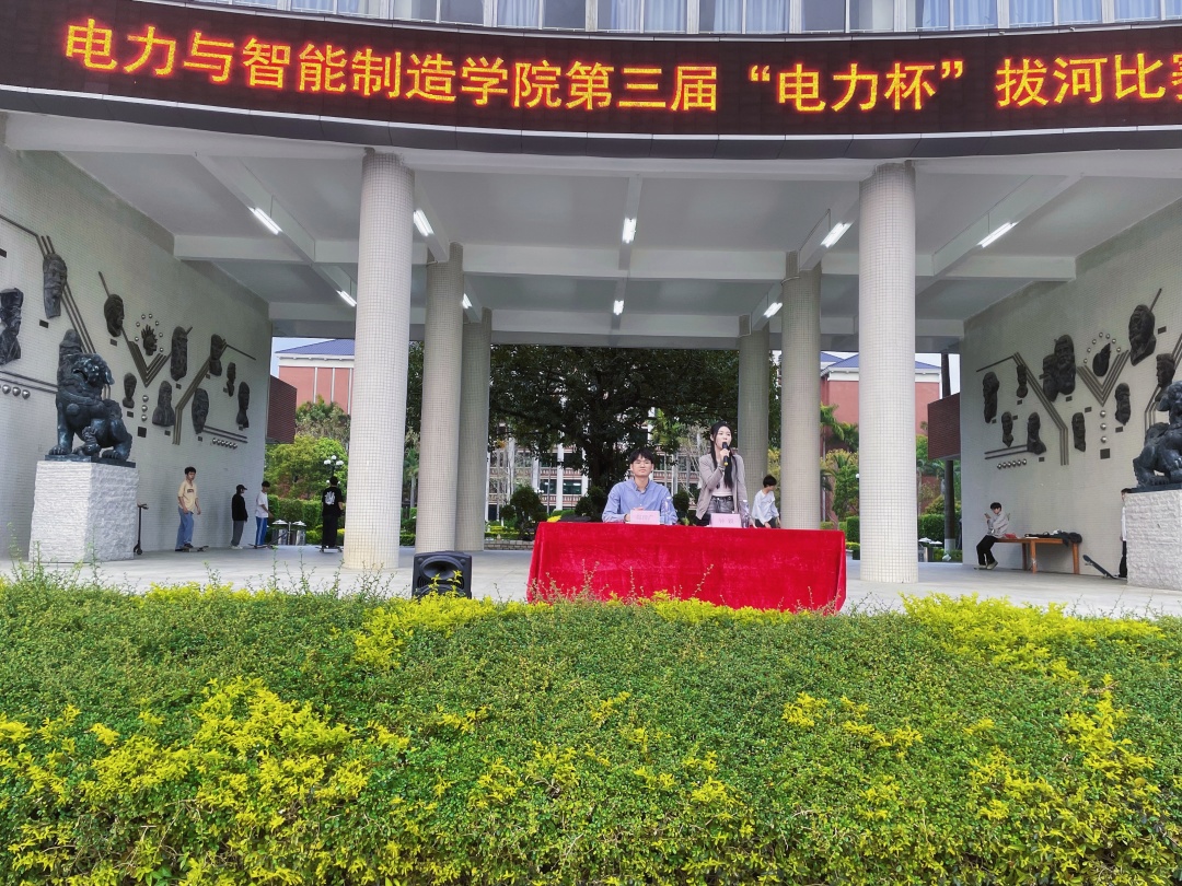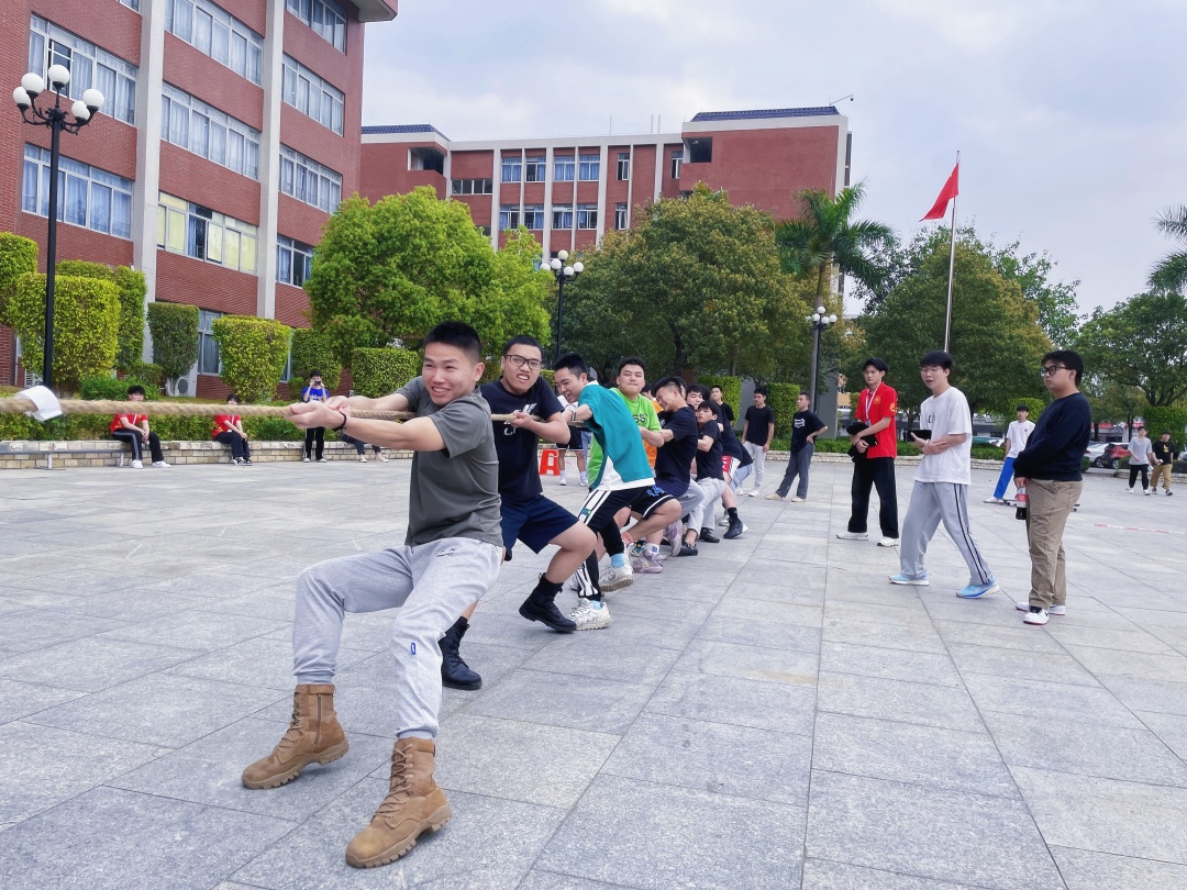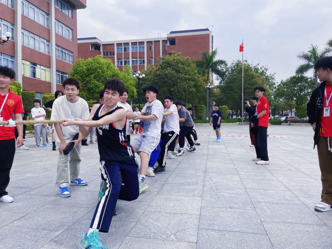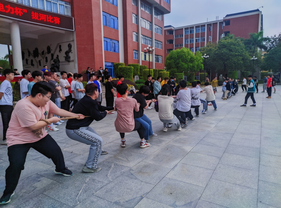 比赛有序进行,裁判哨子吹响;此时,双方队员齐声高喊口令,大家齐心协力,卯足劲将绳子向自己方向拉;双方啦啦队为自己班级加油助威。加油声、呐喊声响切徘徊在广场。