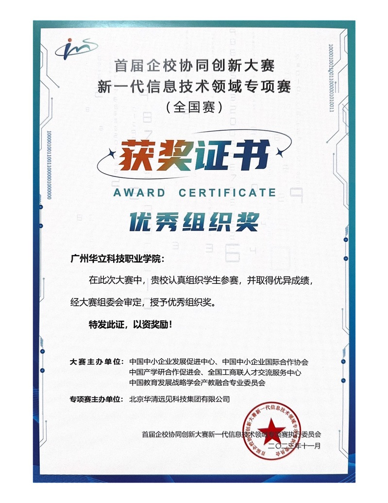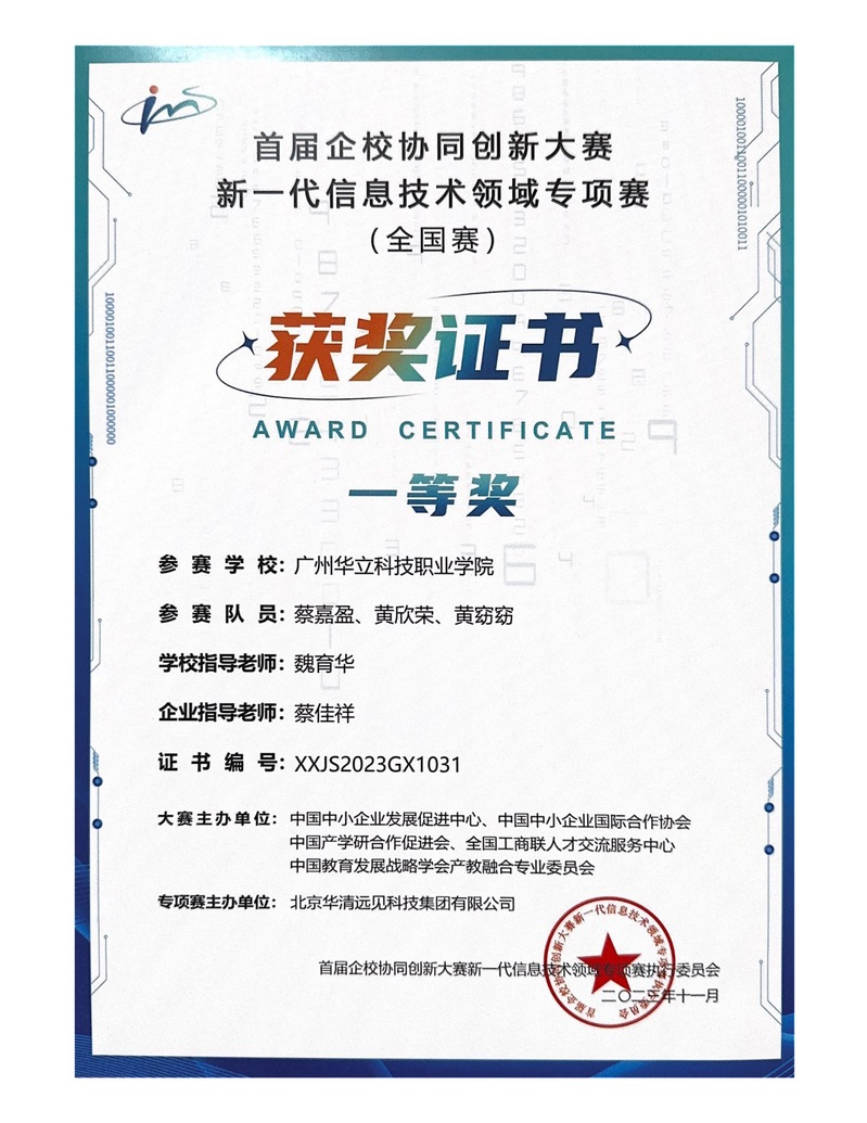 2023全国首届企校协同创新大赛新一代信息技术领域专项赛决赛,11月25日-26日在山东临沂科技职业学院圆满收官。本次大赛从初赛171所院校923支队伍中经过层层选拔脱颖而出的33支代表队伍,从全国各地奔赴决赛现场,参加专项赛前十强的角逐。我校选派电力与智能制造学院林祥智老师指导的麦馨儿、黄烁函、张国峰团队及计算机信息工程学院魏育华老师指导的蔡嘉盈、黄欣荣、黄窈窈团队参赛,经过激烈角逐均获全国赛一等奖,并荣获“优秀组织奖”。林祥智老师指导的学生团队荣获专项赛前十强,将于12月份参加企校协同创新大赛全国总决赛。