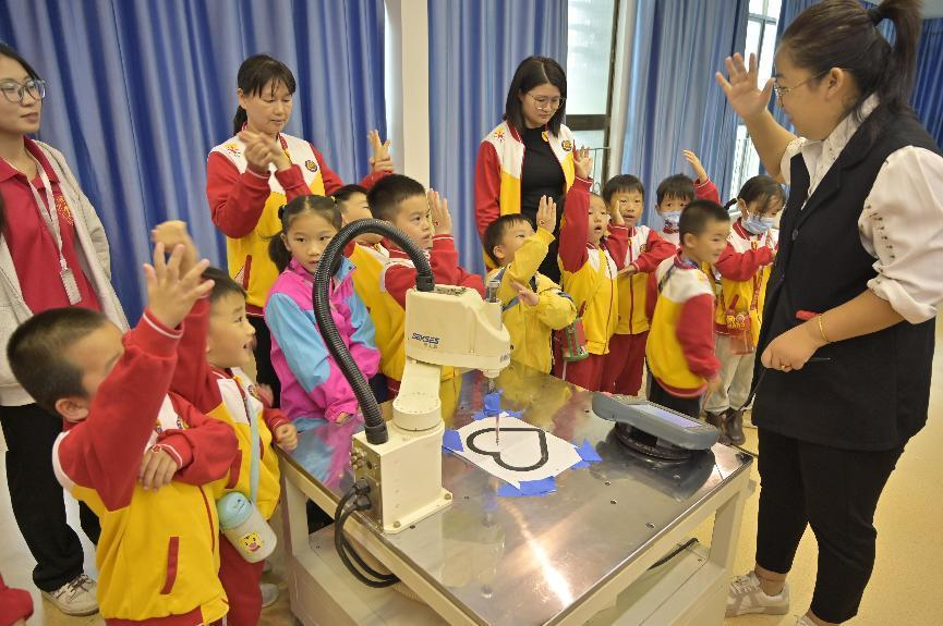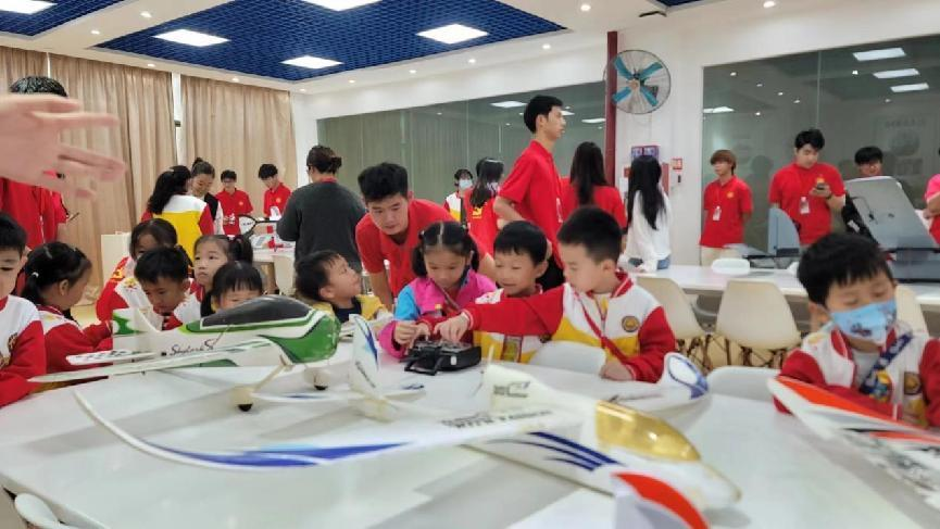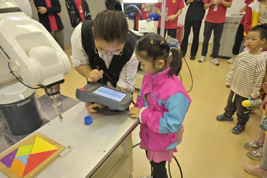 体验、互动,助力点燃小朋友们童梦想,主讲刘杰老师手把手教小朋友们介绍如何使用操控机械人、无人机等,带领他们亲身动手体验,寓教于乐,在一片欢声笑语中交流各自体验到有趣的科技的力量。让孩子们近距离了解工业机器人、无人机、3D打印机的结构,对看似神秘的机器人工作原理有了启蒙认知。