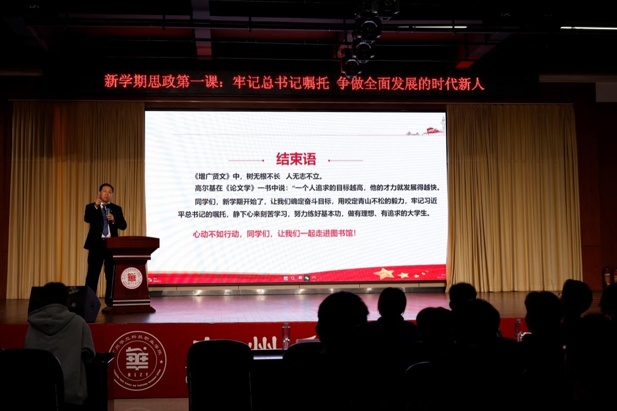 最后,褚玉峰书记讲到,当代大学生生逢其时,施展才干的舞台无比广阔,实现梦想的前景无比光明。要求同学们在新学期要确定奋斗目标,用咬定青山不松的毅力,牢记习近平总书记的嘱托,静下心来刻苦学习,努力练好基本功,做有理想、有追求、有担当、有作为、有品质、有修养的大学生。