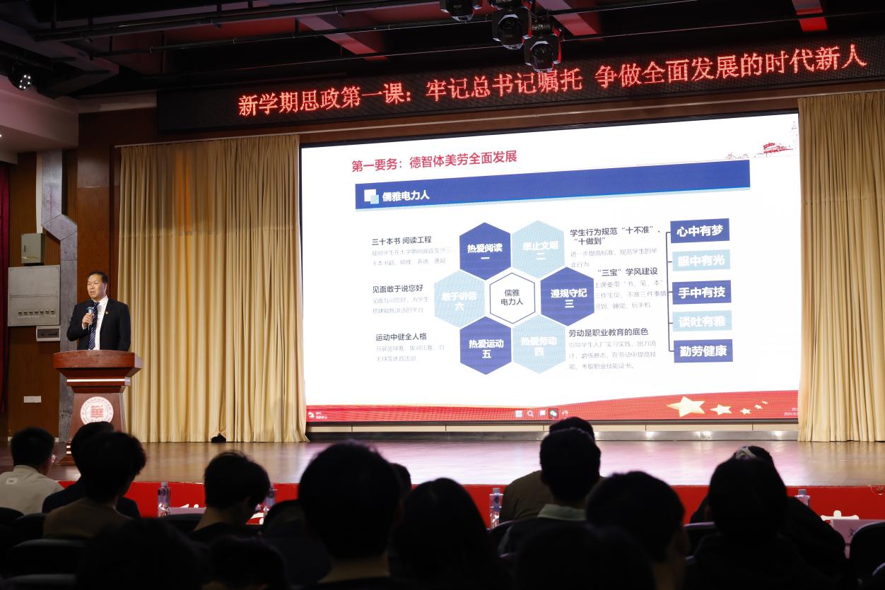 接着他分别对“四个第一”进行了详细地讲解,重点讲解了学院开展的“儒雅电力人”文化创建活动的意义,号召同学们新学期开始,要怀抱梦想又脚踏实地,敢想敢为又善作善成,以“四个第一”为基础,立志做有理想、敢担当、能吃苦、肯奋斗的新时代好青年,让青春在全面建设社会主义现代化国家的火热实践中绽放绚丽之花。