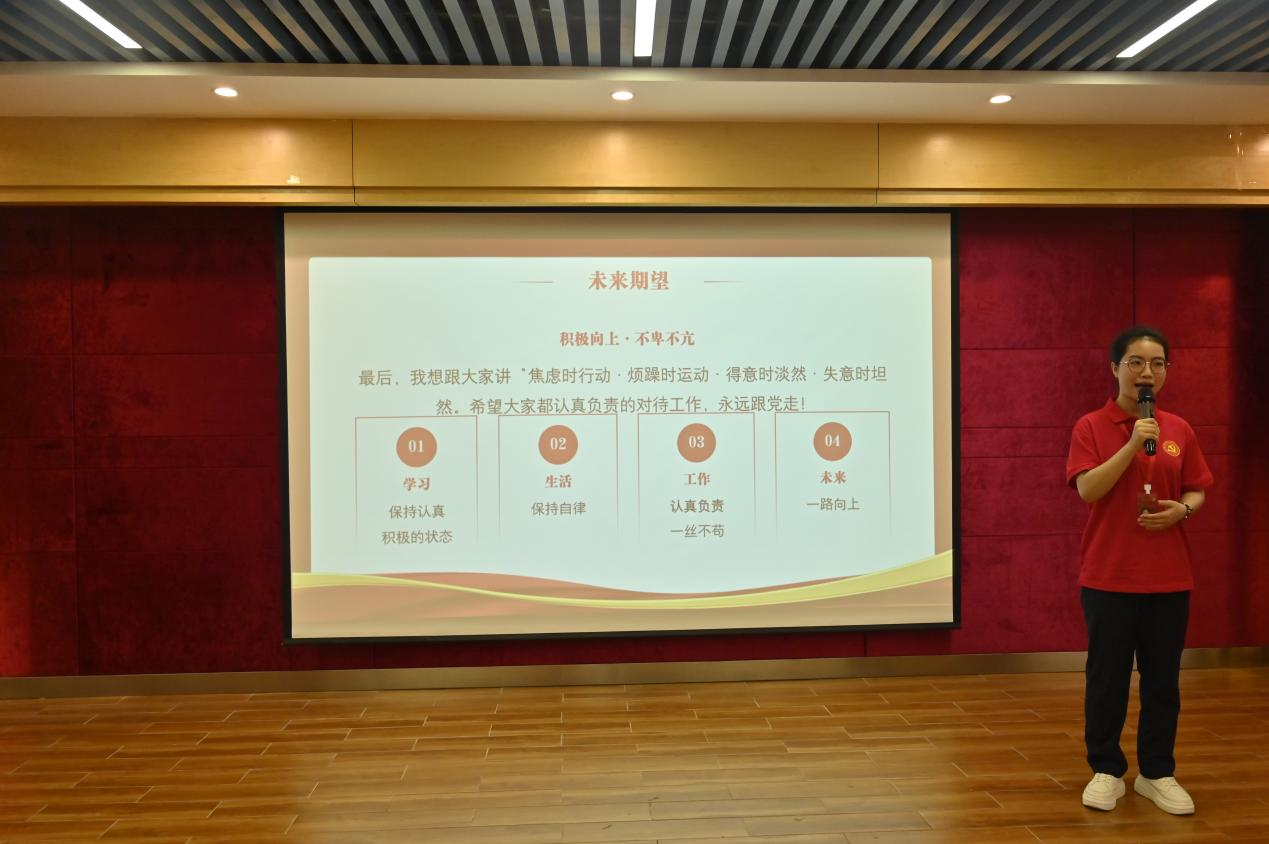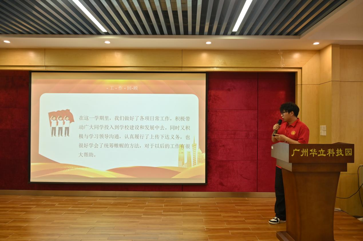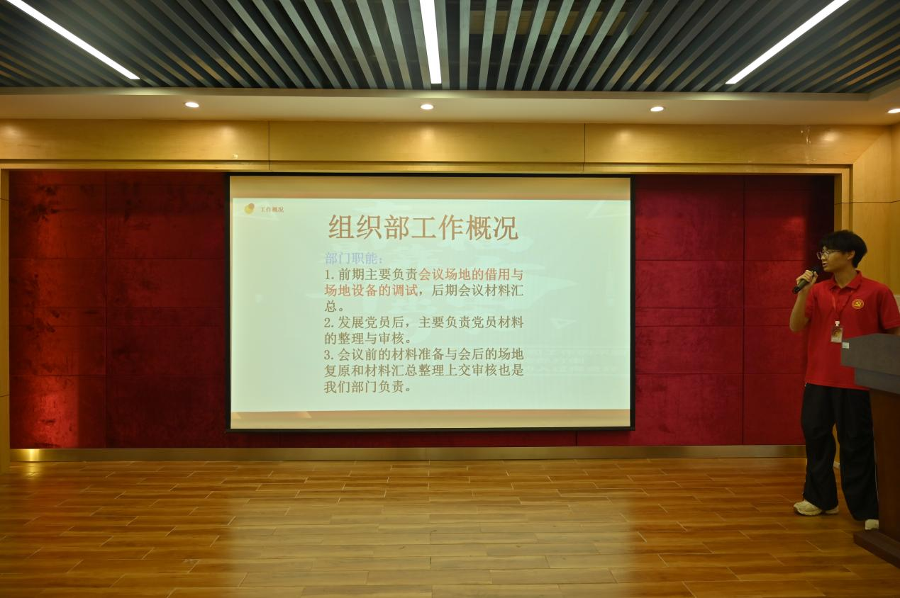 第一项议程,由学院党总支学生党建小组各部门代表秘书部周慕丹同学、组织部林文锦同学、新闻部陈卓怡同学、信息部周敖同学四人分别上台汇报上一学期的工作总结。学生党建小组总负责人傅晓铭同志对党建小组过去一学期里的工作进行汇报。