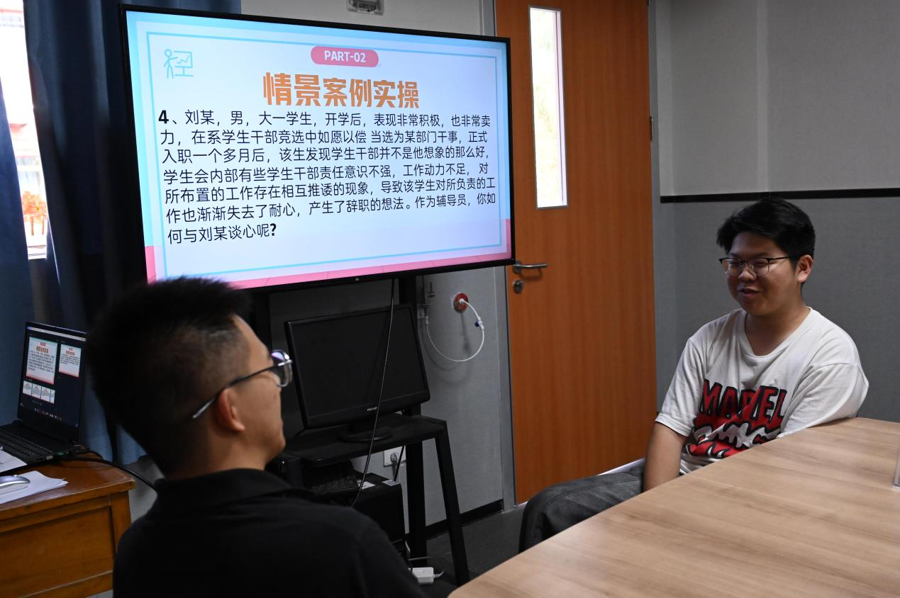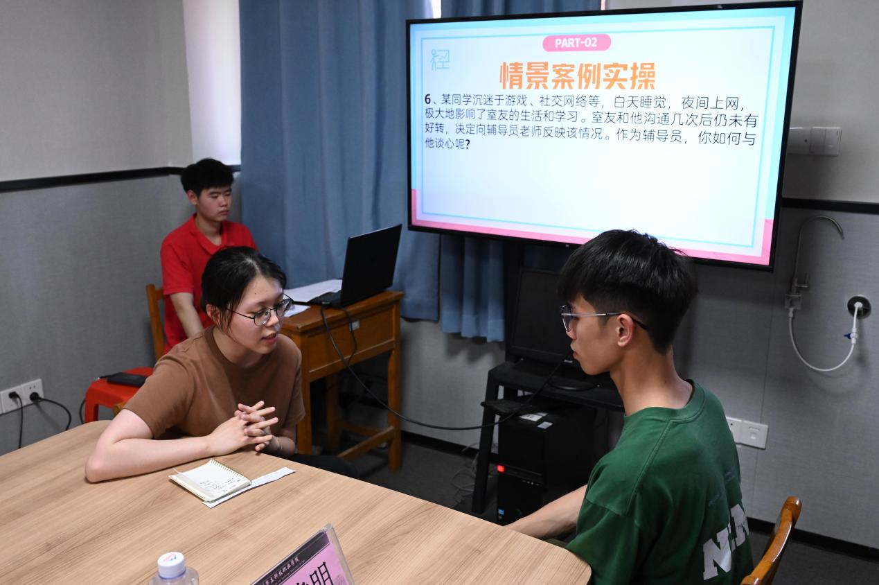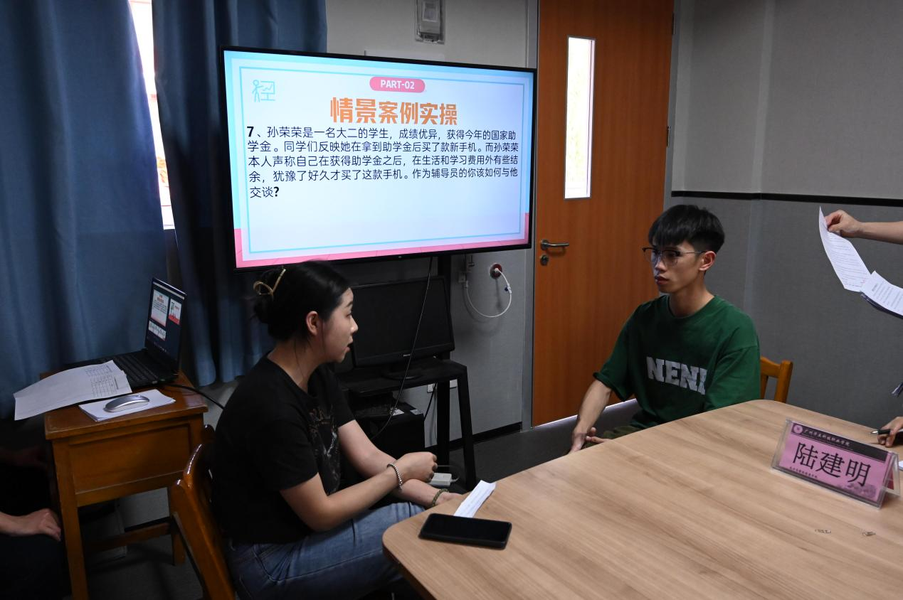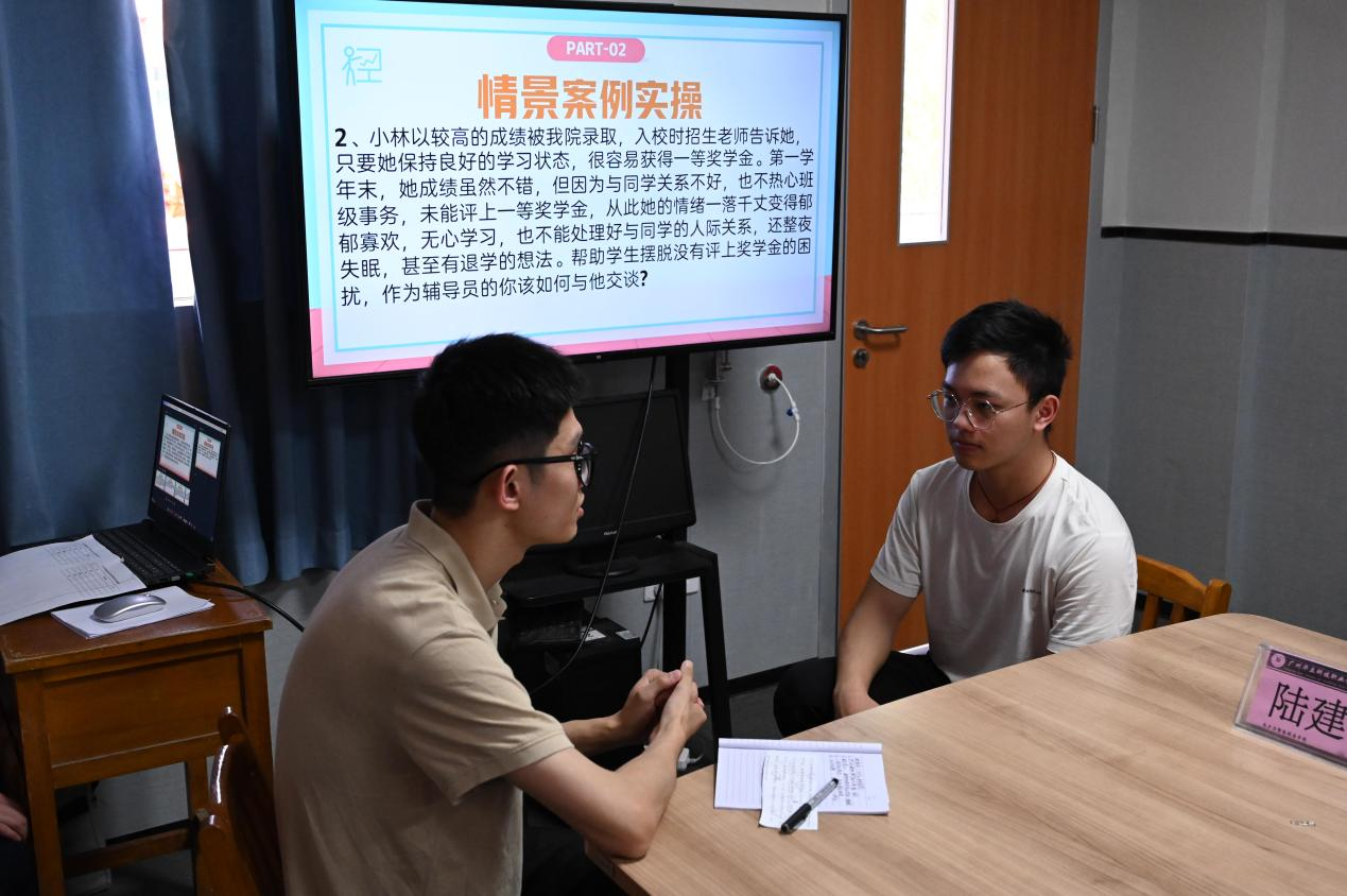 接着,各位辅导员按照现场抽签顺序依次开展“主题班会”和与学生开展谈心谈话的“情景案例实操”,然后,由评委进行评分。经过各位老师的努力,最终刘留老师获得“一等奖”,刘浩老师获得“二等奖”,钟颖、赖锦康、邹思敏老师分别获得“三等奖”。