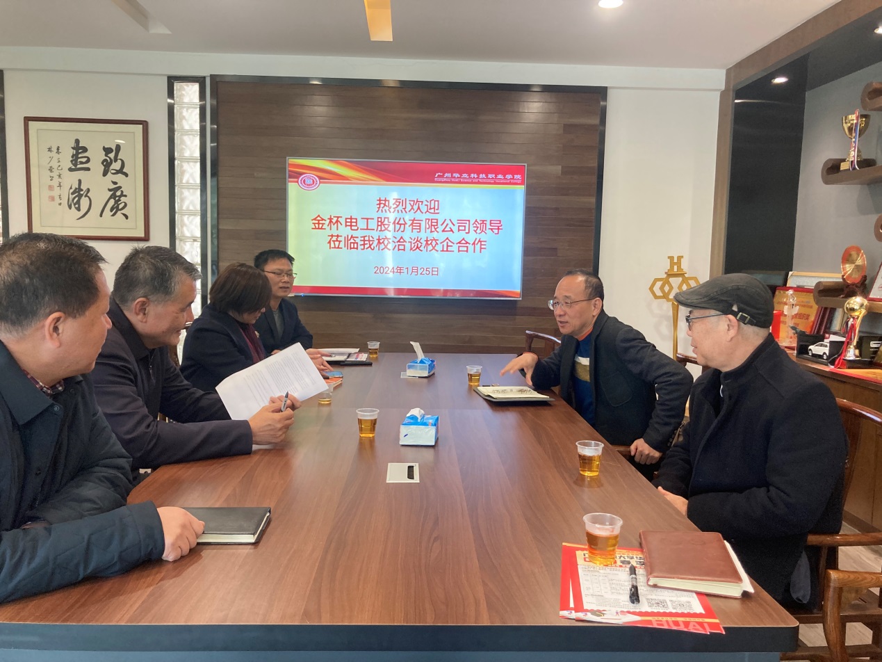 1月25日上午,学校邀请“金杯电工股份有限公司”领导来校洽谈校企合作。学校校长陈德清,副校长马俊,产教融合办科长韦建林,电力与智能制造学院院长褚玉峰、就业主任杨军等人参加了会议。