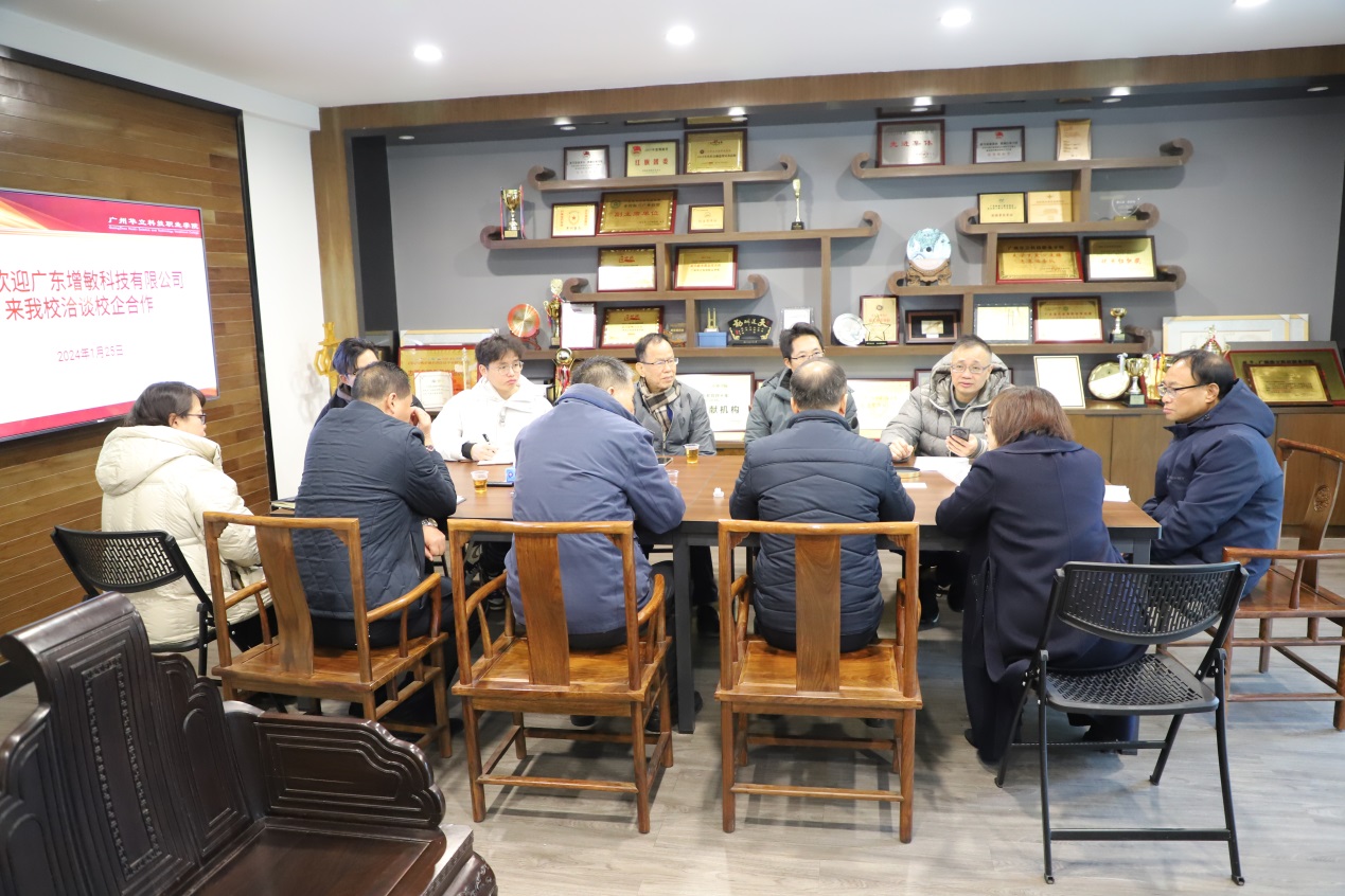 1月25日下午,学校邀请“广东增敏科技有限公司”领导来校洽谈校企合作。学校校长陈德清,党委书记陈良声、副校长马俊,科研处处长温伟胜、计算机信息学院党总支书记闵小翠、电力与智能制造学院院长褚玉峰、就业主任杨军等人参加了会议。