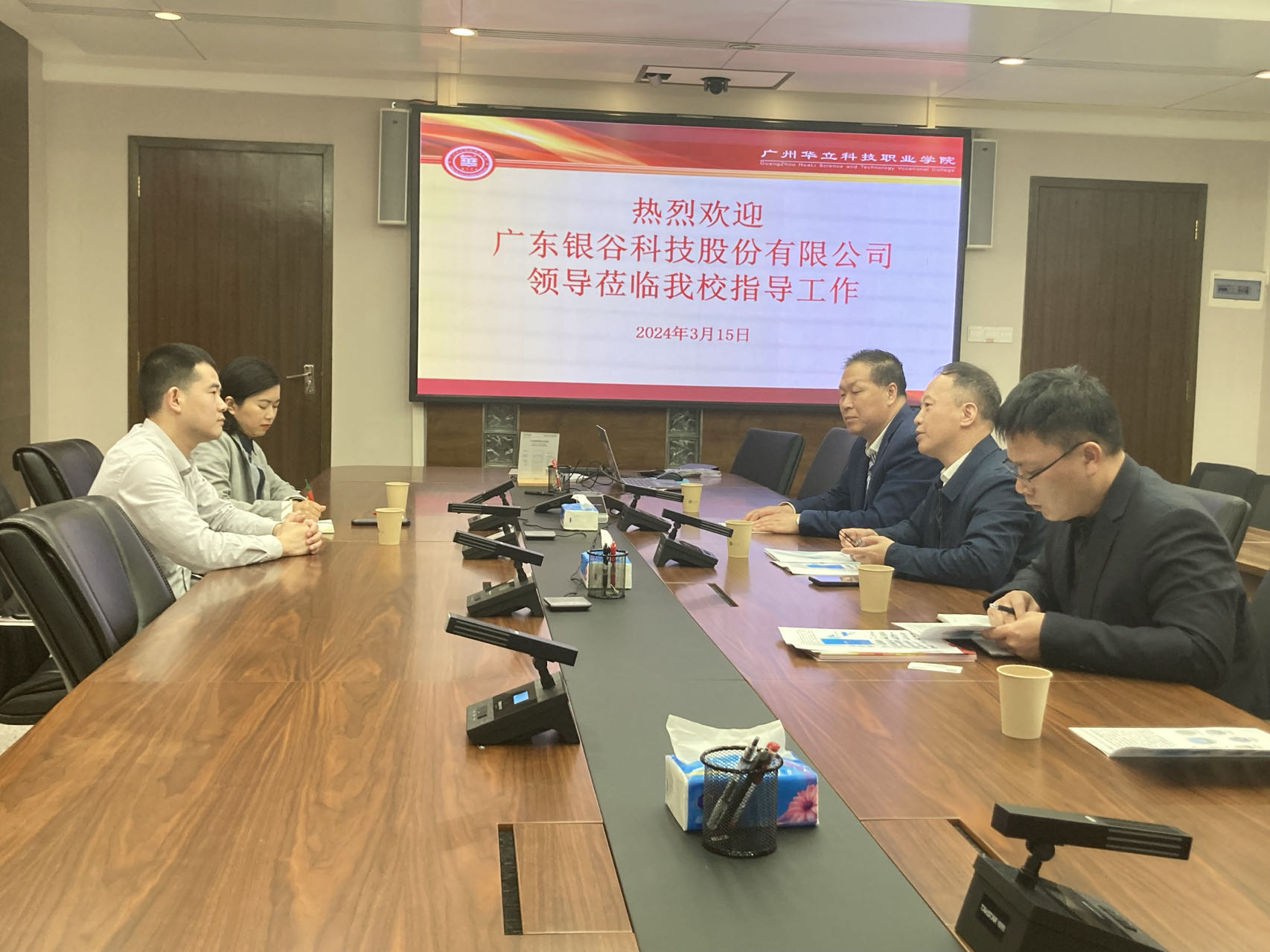 3月16日下午,学校邀请“广东银谷科技股份有限公司”领导来校洽谈校企合作。学校党委书记陈良生、产教融合办科长韦建林、电力与智能制造学院院长褚玉峰、就业主任杨军等人参加了会议。