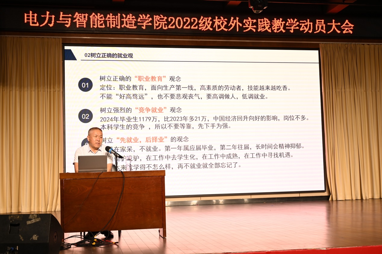 校外教学主任杨军在动员会上重点讲了,校外教学的具体安排、需要完成的教育任务、提交作业的时间节点、毕业设计的选题要求、校外教学应注意的安全事项等等,鼓励同学们要在校外教学过程中,保持谦虚态度,虚心向企业师傅学习,掌握真技能、真本领。