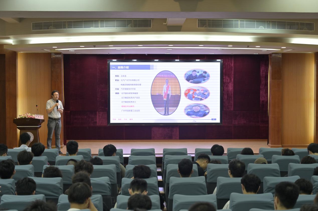 为贯彻落实党的二十大精神,我校开展了以“技能:让生活更美好”为主题的职业教育周暨劳动教育月活动,大力宣传劳模精神、劳动精神、工匠精神,弘扬劳动光荣、技能宝贵、创造伟大的时代风尚,不断推进职业教育高质量发展。电力与智能制造学院于5月30日在图书馆1号报告厅举办“弘扬劳模精神、发展新质生产力、让生活更美好”专家讲座,电力与智能制造学院汽车系学生和专业教师参加该讲座。本次讲座邀请了增城区劳动模范、北汽股份研发突破奖获得者、北汽广州汽车有限公司电器及智能网联高级经理王新龙。