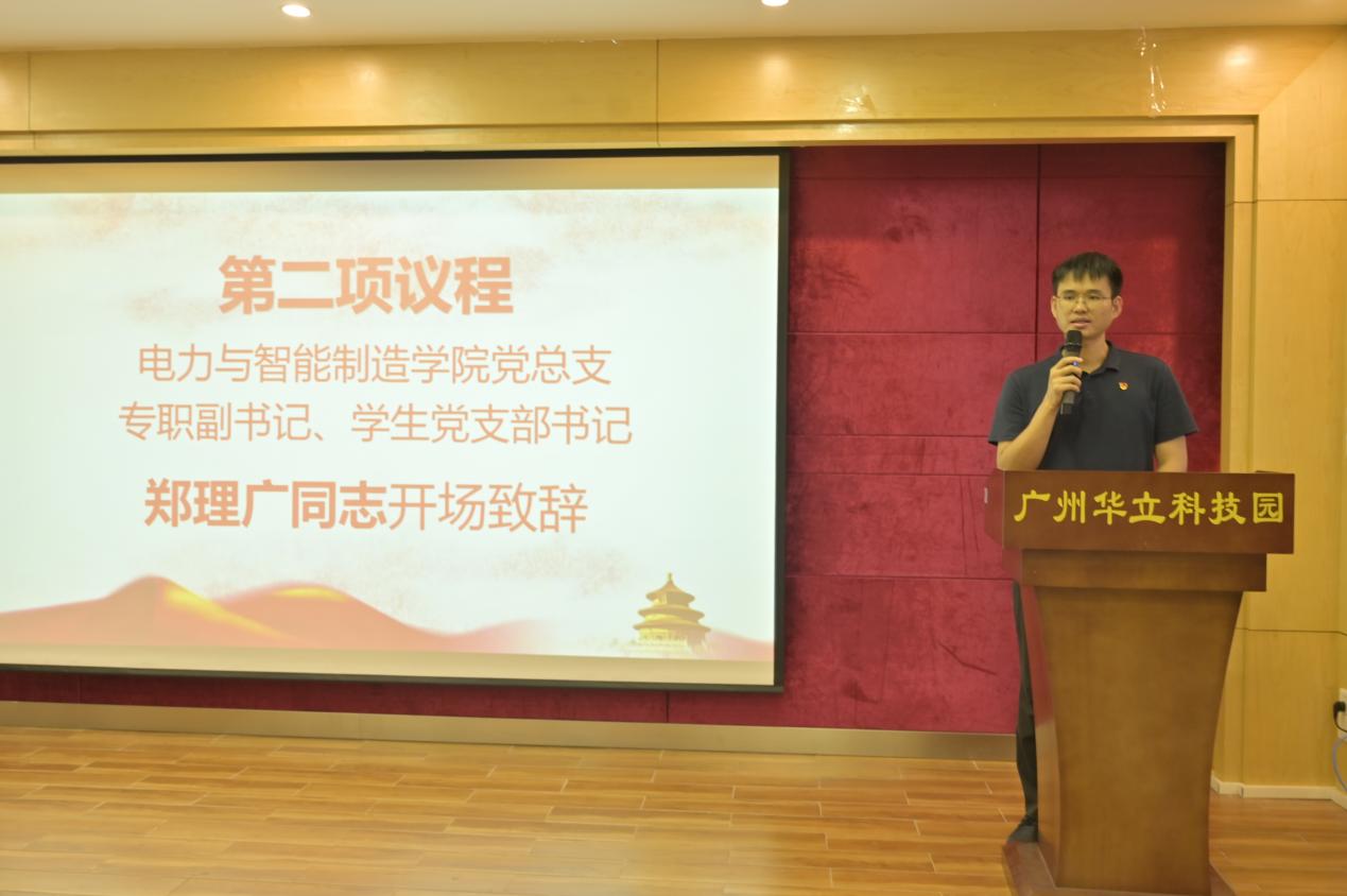 随后,电力与智能制造学院党总支专职副书记郑理广发表开场致词,他对本次大会的顺利召开表示热烈的祝贺,并向新一届全体学生干部的荣任表示祝贺。同时,郑理广书记对上一届全体学生干部积极工作以及为学院所做出的贡献表示衷心的感谢,他回顾了过去一年党建小组在学院领导和老师的支持下取得的显著发展,并强调换届是新的起点,希望新一届团队不忘初心,砥砺前行,引领党建取得更大成就,为学校发展贡献青春力量。