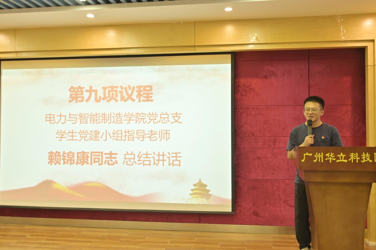 最后,电力学院学生党支部组织委员、学生党建小组指导老师赖锦康进行总结讲话。他强调电力学院学生党建小组成功举行第七届换届大会,彰显了年轻干部的活力与担当。他回顾了第七届小组在学校的领导下圆满完成任务,实现了创新突破,并对上届党建小组成员的付出表示了感谢。同时,他对第八届党建小组成员寄予厚望,期待他们继承传统,发扬优势,以德才兼备、谦虚友善、锐意创新为准则,为学院党建小组的发展做出更大贡献。