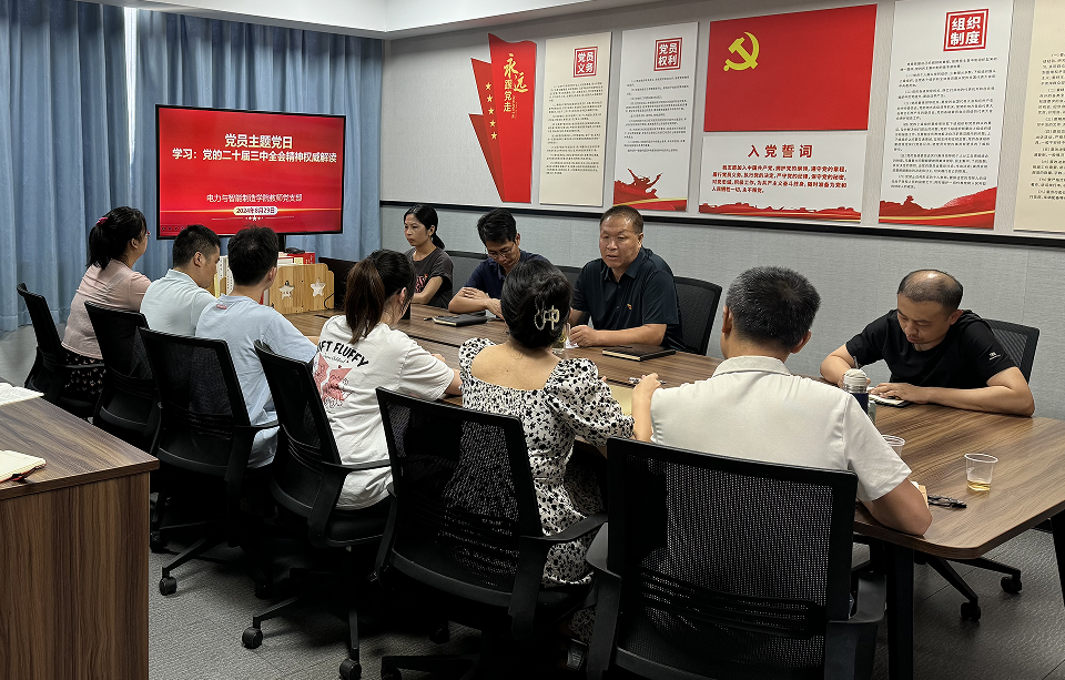 新学期教师返校后,8月29日下午,电力与智能制造学院教师党支部组织全体教师党员开展学习“党的二十届三中全会精神,学院党总支书记褚玉峰及教师党支部全体党员参加了会议,会议由教师党支部孙令真书记主持。