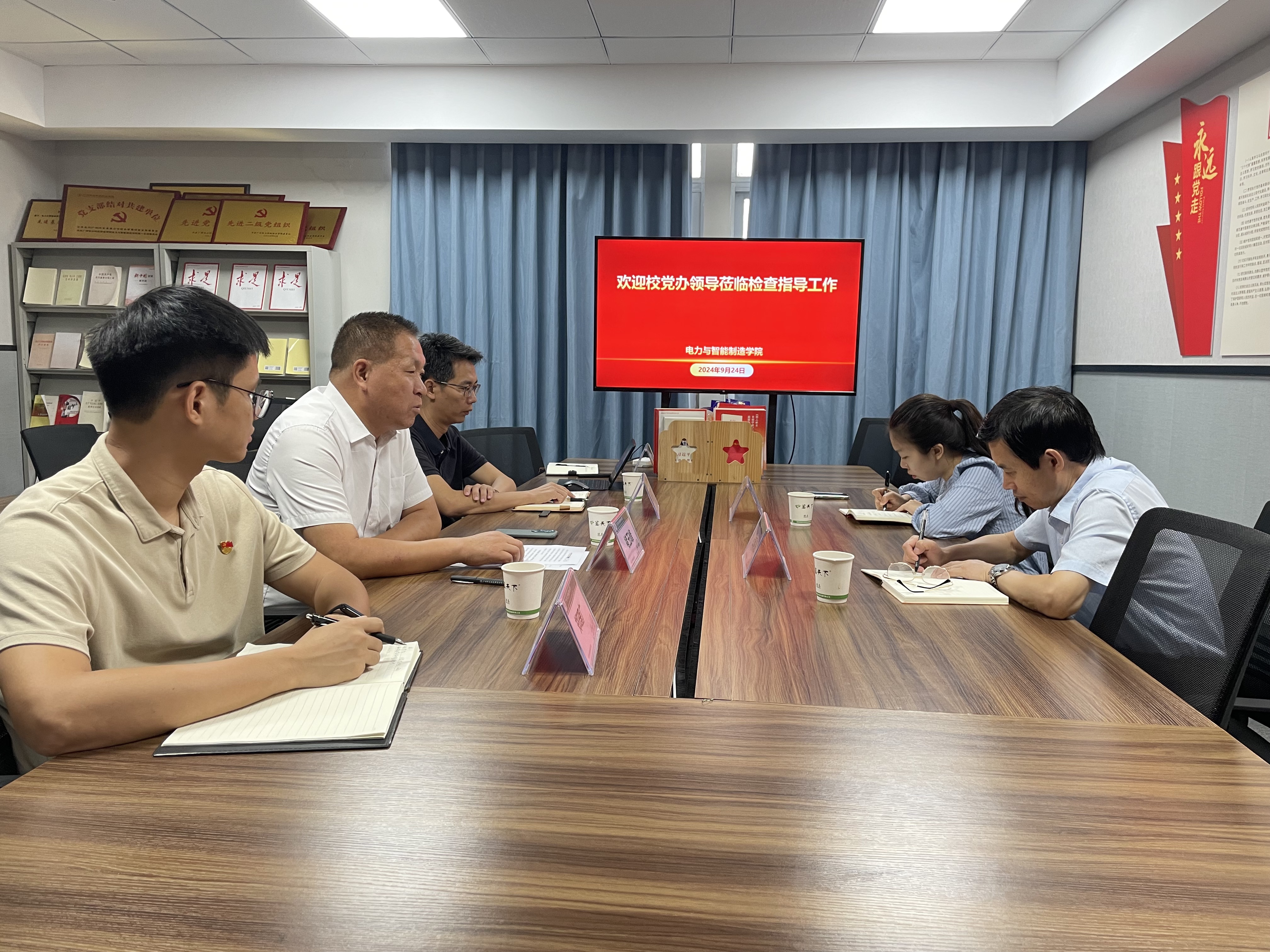 9月24日上午,学校党委办公室主任石朝阳带领党委组织部副部长陈晓薇,来到电力与智能制造学院检查和指导党建工作,学院党总支委员参加调研座谈会。会议由学院党总支书记、院长褚玉峰主持。