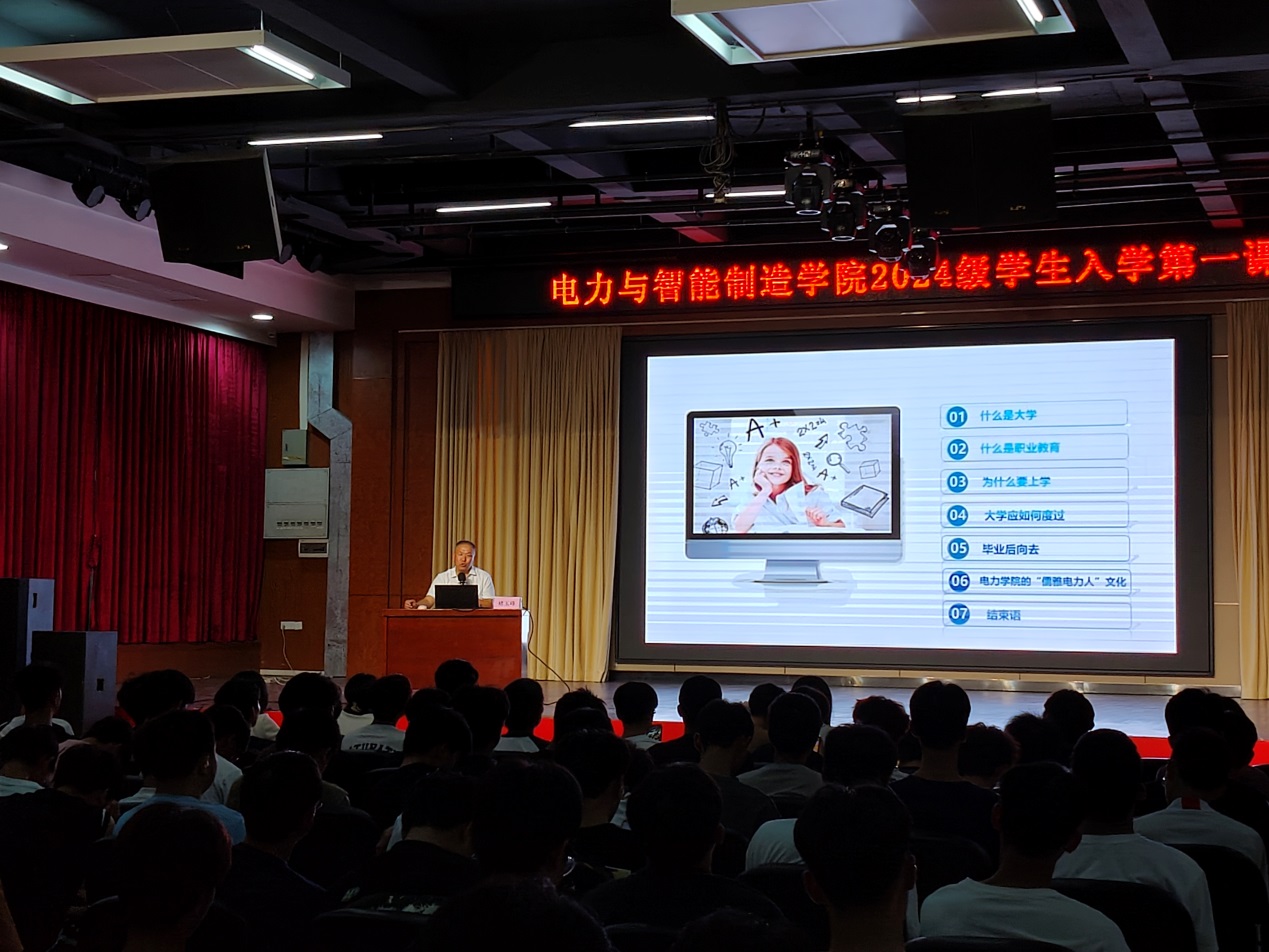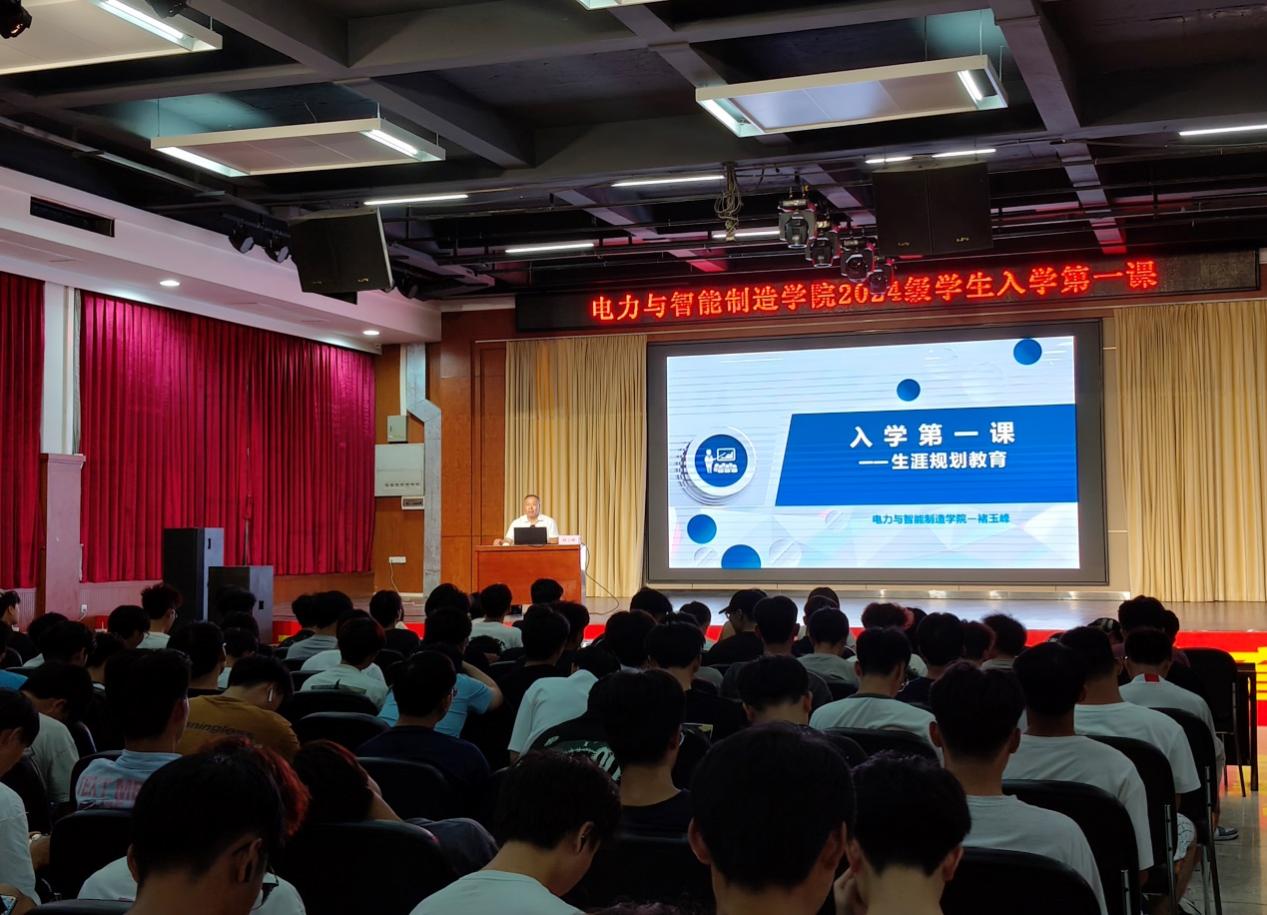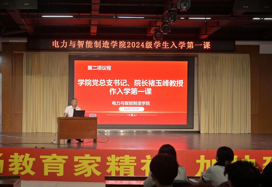 扬帆起航,迎接新挑战。为了帮助新生快速适应新环境、融入大学生生活,10月21日和10月23日,电力与智能制造学院党总支书记、院长褚玉峰给24级全体新生上了入学教育第一课暨大学生生涯规划教育。会议由林文锦同学主持,学院党总支书记、院长褚玉峰教授,学院党总支副书记、学管副主任郑理广老师,学院团委书记钟颖老师,2024级辅导员及全体2024级新同学参加了会议。