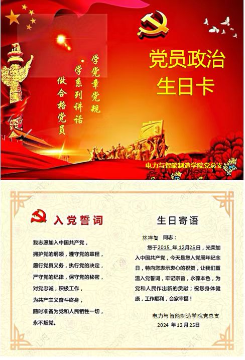 时光荏苒,如白驹过隙,在忙碌与奋进中,12月25日迎来了属于自己的一个特殊日子——“政治生日”,作为电力与智能制造学院党总支教师党支部的一名教师党员林祥智,在这特殊的时刻,不仅是对个人党员政治生涯的一次回顾,更是党性修养再度升华的重要契机。