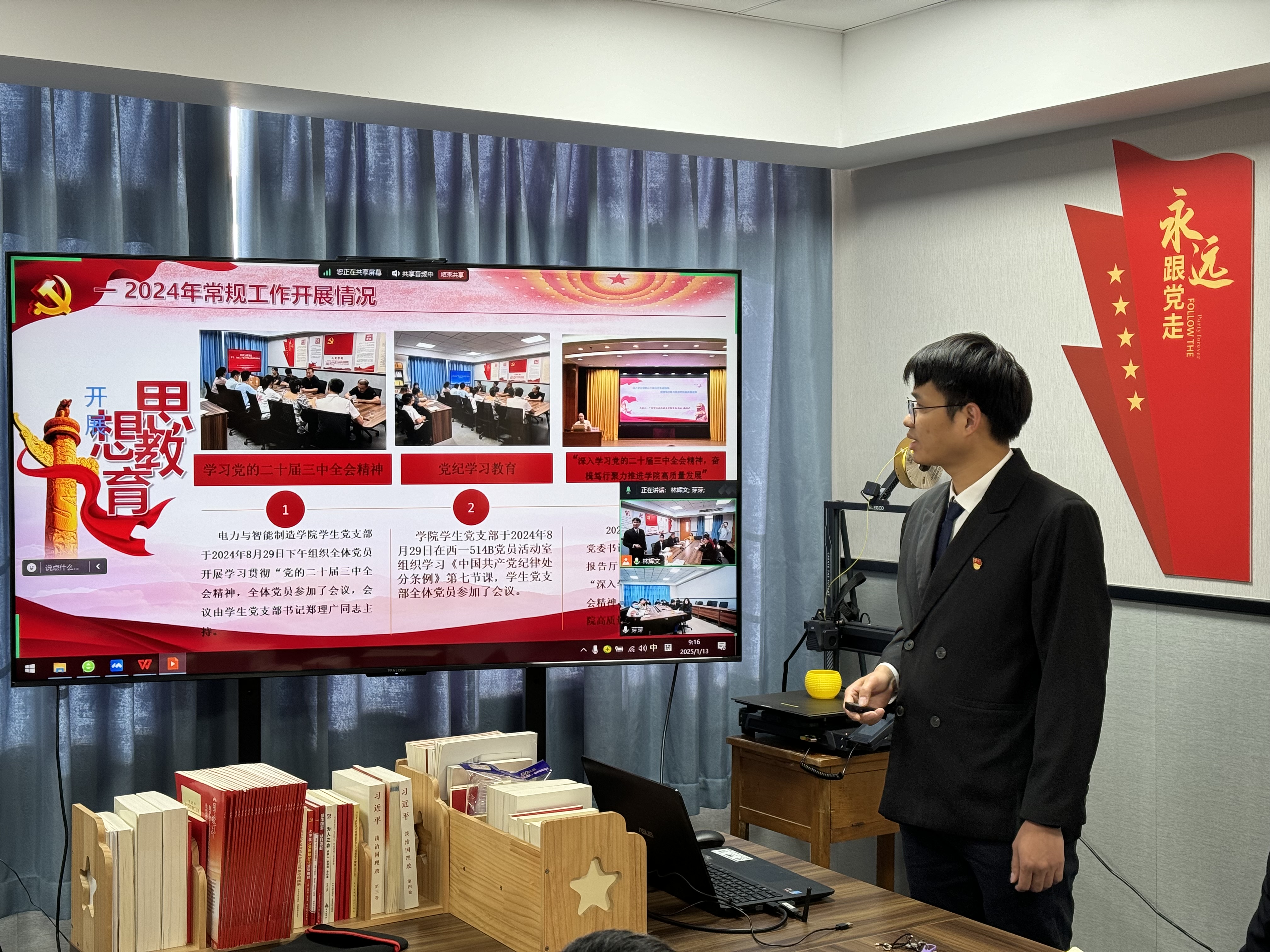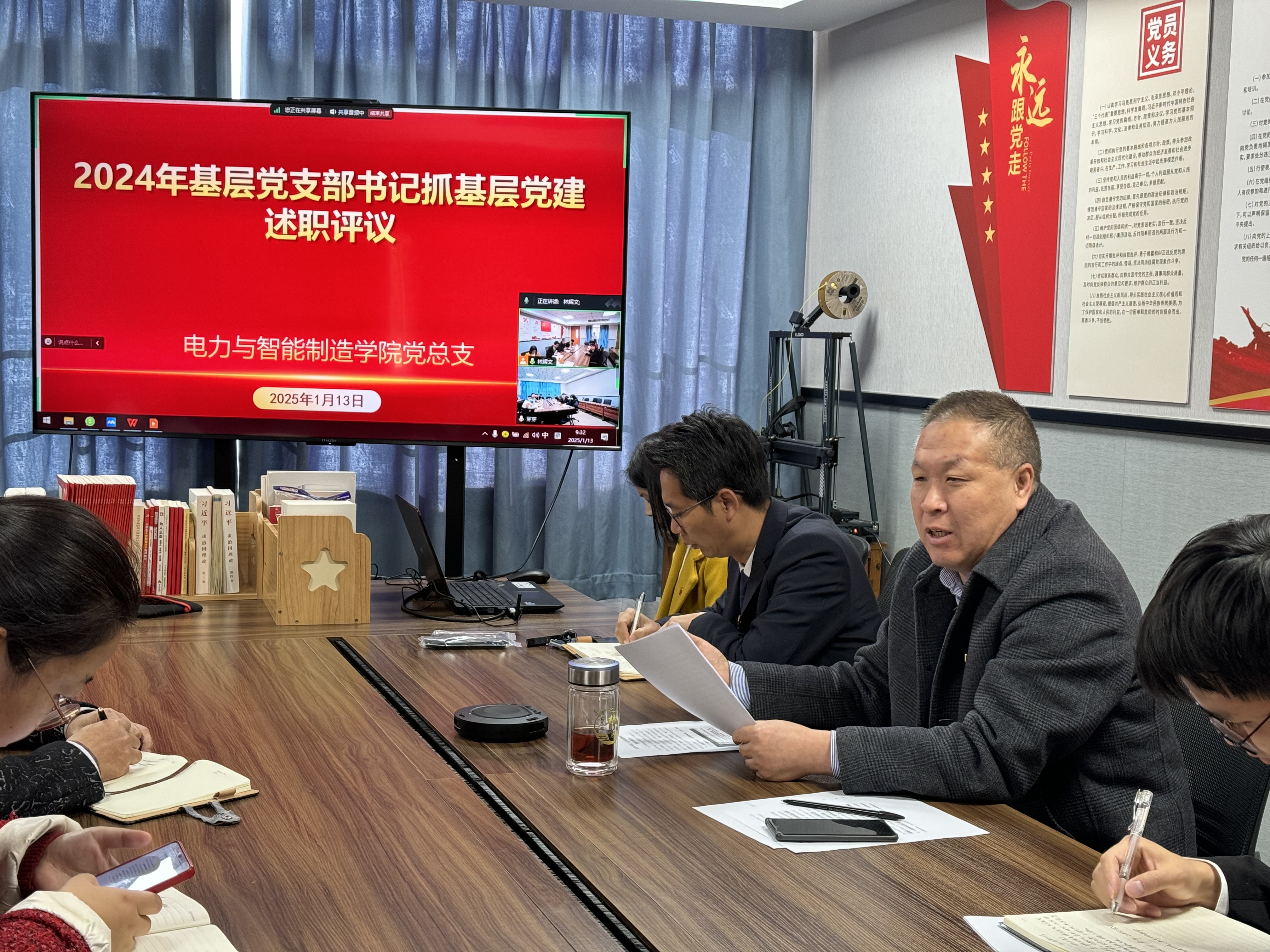 为全面贯彻落实习近平新时代中国特色社会主义思想和党的二十大、二十届三中全会精神,巩固党纪学习教育成果,展示学院一年来党建工作成效,提升党支部党建水平。1月13日上午,电力与智能制造学院党总支通过连线方式,召开了2024年党支部书记抓党建述职大会,会议由学院党总支书记褚玉峰主持,教师党支部书记、学生党支部书记、云浮校区党支部书记及全体党员参加了会议。