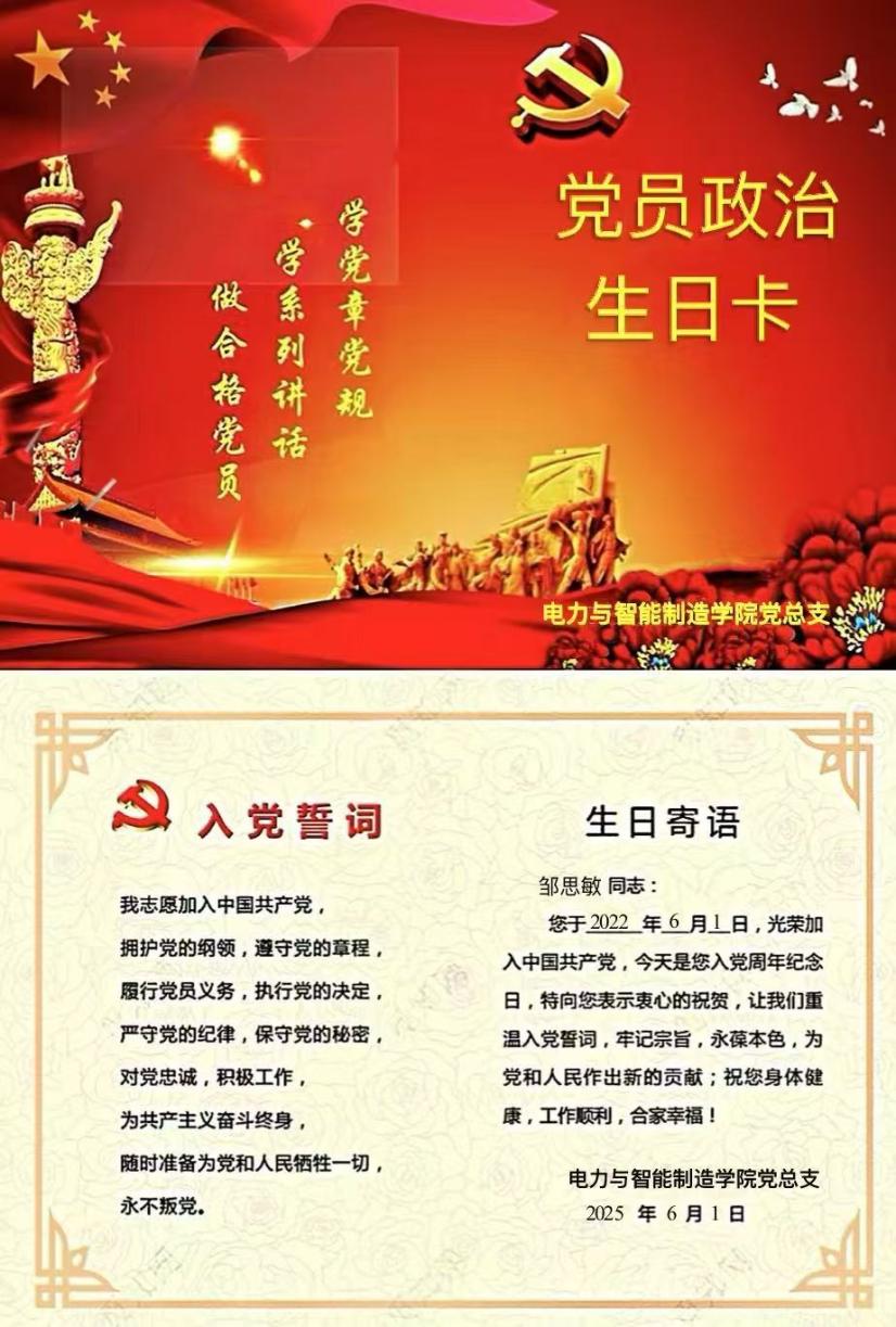 作为电力与智能制造学院党总支教师党支部的一名教师党员邹思敏61日早上,收到了学院党组织的发“政治生日”贺卡,心情特别兴奋,202161日是我加入中国共产党的日子。