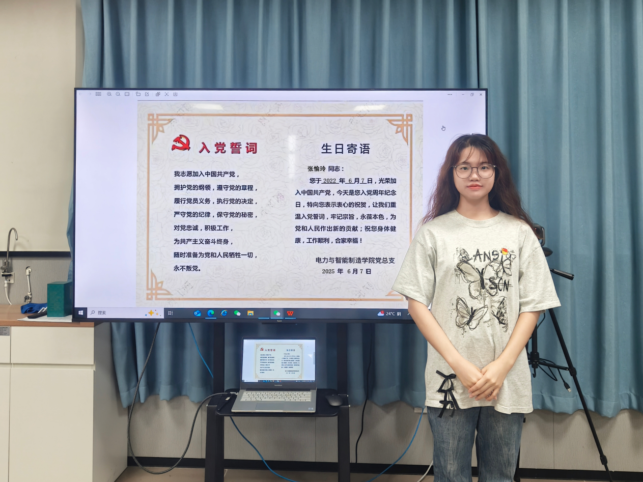 6月7日,电力与智能制造学院的党员教师张愉玲收到了学院党组织发的“政治生日”贺卡。一场庄重且意义非凡的政治生日活动在学校会议室举行。活动在庄严的氛围中拉开帷幕,张愉玲同志面向鲜艳的党旗,举起右拳,重温入党誓词。每一个字都掷地有声,每一句誓言都饱含着对党的忠诚和为党的事业奋斗终身的决心。这不仅是对入党初心的重温,更是对未来行动的承诺,激励着党员们时刻以高标准严格要求自己,在工作和生活中发挥先锋模范作用。