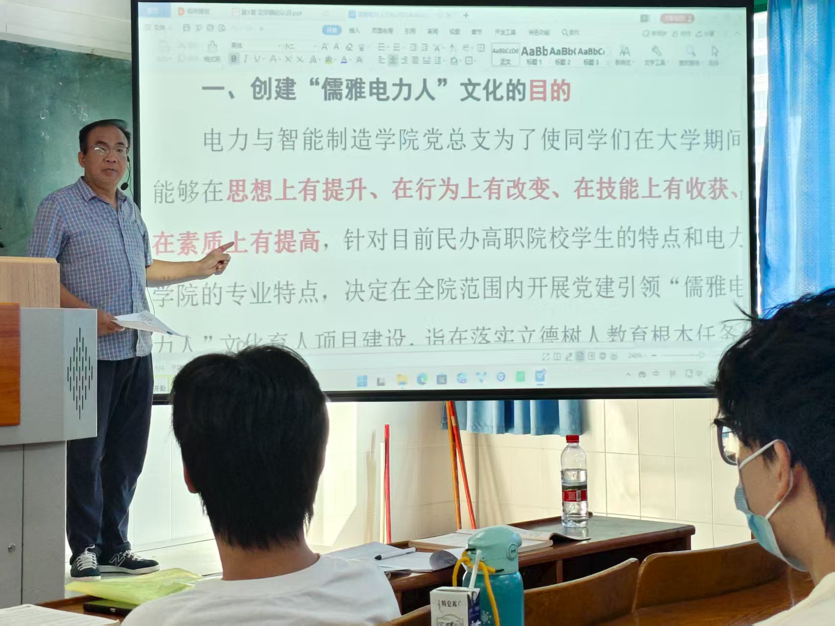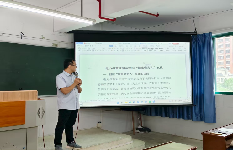 在“儒雅电力人”文化讲解环节,教师们结合学院发展历程与各个专业行业特色,从“儒雅”的精神内涵、行为准则展开阐述。引导学生理解“儒雅”不仅是外在言行的得体,更是内在专业素养、责任担当的体现。在实验室中严谨操作、在学习中谦逊求知、在未来工作中恪守行业规范,皆是“儒雅电力人”的生动实践。针对大一新生,教师重点讲解文化认知与角色转变,帮助其建立学院归属感;对于大二,则结合专业学习进度,强调将文化理念融入专业实践。各位老师还为学生们讲解了“三宝学风”建设内涵。“书、笔、本|”三件宝贝,作为学风建设的核心载体,需要学生每节课都携带,方便记录教师补充内容和做作业,这些都属于学习态度的考核内容。