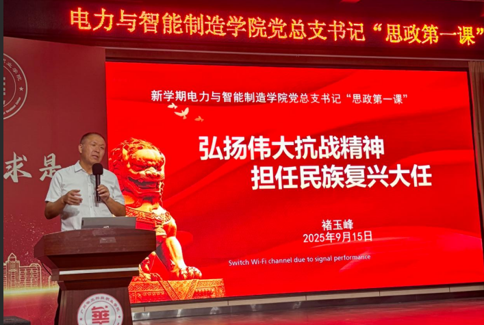 根据学校党委的安排部署,9月15日在图书馆8楼,电力与智能制造学院党总支书记褚玉峰教授以“弘扬伟大抗战精神,担任民族复兴大任”为题目,为2025级电力系统自动化技术、电气自动化技术、智能制造技术等三个专业的新同学讲授“思政第一课”。