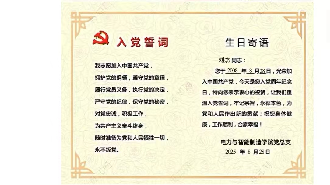 作为电力与智能制造学院教师党支部的一名教师党员刘杰,8月28日早上收到了学院党组织发来的“政治生日”贺卡,心情特别兴奋,转眼间,加入中国共产党已经17年。
