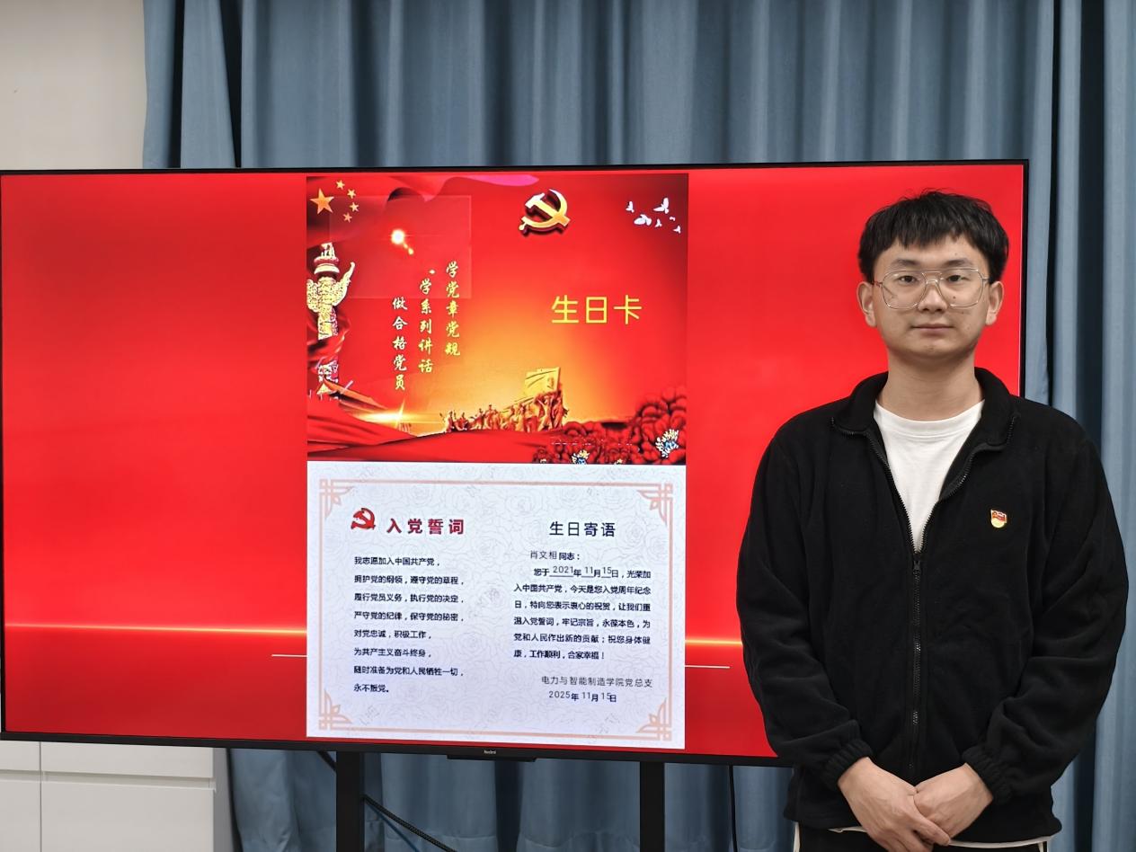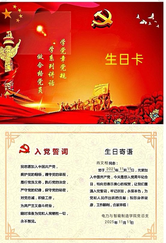 作为电力与智能制造学院的一名教师党员肖文相,11月15日在收到学院党组织发来的“政治生日”贺卡,我的心情格外激动,感谢组织的关怀。时间飞逝,转眼间加入中国共产党已经4年。
