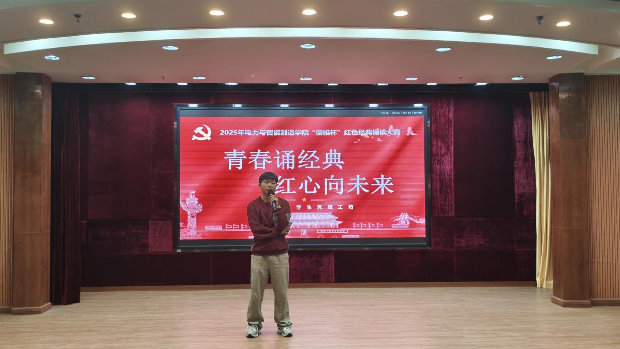 为贯彻落实党的二十大精神,传承红色基因,赓续红色血脉。12月18日,电力与智能制造学院举办了以“青春诵经典,红心向未来”为主题的“儒雅杯”红色精典诵读大赛。参加本次大赛的有:学院党总支书记褚玉峰,党总支专职副书记、学管主任郑理广,团委书记王明伟,学生党建工坊指导老师王凯,25级辅导员以及学生代表,大赛由学院学生党建工坊承办。