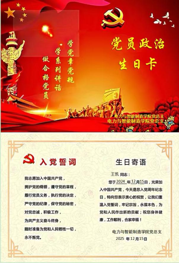我是王凯,作为电力与智能制造学院的一名党员辅导员,12月15日在收到学院党组织发来的“政治生日”贺卡,我感到既开心又兴奋,同时也感谢组织的关怀。