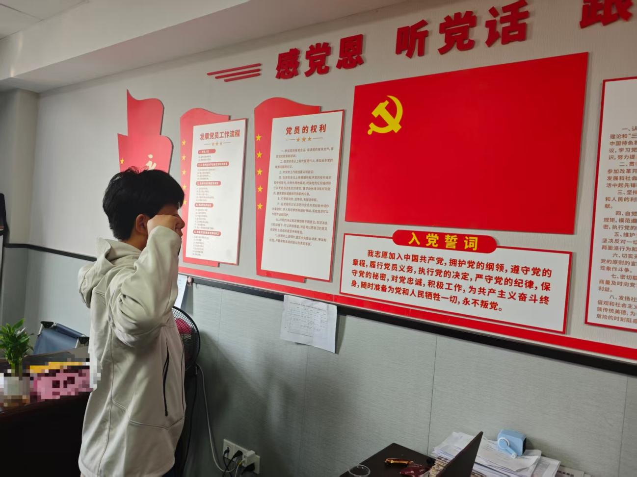 我在“政治生日”这天重温了入党誓词,在鲜红的中国共产党党旗前,我佩戴党徽,举起右拳,宣誓“我志愿加入中国共产党,拥护党的纲领,遵守党的章程……”铿锵有力的誓言回荡在活动室的每个角落,既是对初心的回望,也是对信仰的淬炼。在重温誓词的过程中,再次感受入党时的赤诚与激昂,进一步坚定了为共产主义事业奋斗终身的信念。