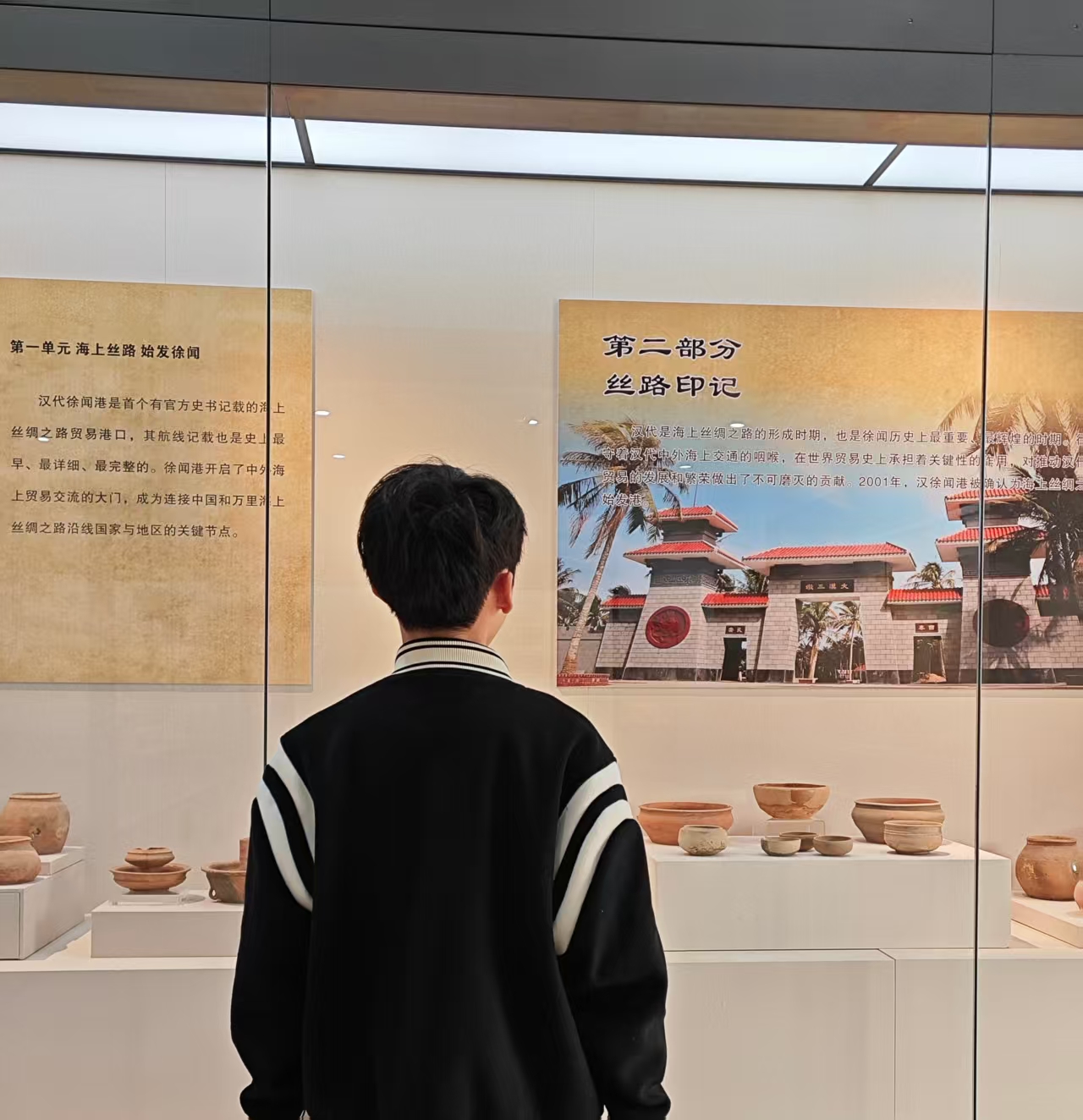 25级电力4班的陈宣任同学,参观了其家乡的徐闻县博物馆。他表示,通过观看“海上丝路始发徐闻”和“丝路印记”等实物摆件和照片,消除了他对这段历史的陌生感。原来早在汉代,徐闻这座港口就已成为官方记载的海上丝路起点,那些被精心摆放的陶器,或许曾装载过丝绸与瓷器,顺着季风驶向东南亚乃至更远的海域。同时他表示,博物馆里的物件,不再是冰冷的古物,而是鲜活的见证,让他真切地触摸到“万里丝路”不是书本里的抽象概念,而是由无数艘商船、无数次远航编织成的文明纽带。而当他走出展厅时,阳光透过玻璃洒在那些陶器上,泛起温润的光泽。让他忽然间明白,博物馆的意义,正是让我们在与历史的对话中读懂自己——徐闻港的帆影早已远去,但它留下的开放与探索精神,依然在今天的海风中延续着。