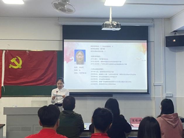 会议开始,由方妙莉、冼宇婷、陈波思3位发展对象,依次向党组织汇报自己考察期表现。她们表明,在这一年里,自身的党性修养以及学习能力、工作能力相比较于原先,都有很大程度的提升。并表明,自身尚且存在缺点和不足,在今后的学习生活当中,将会更加严格地要求自己,坚定不移跟党走,为党的事业贡献自己的一份力量,为共产主义事业奋斗终生!