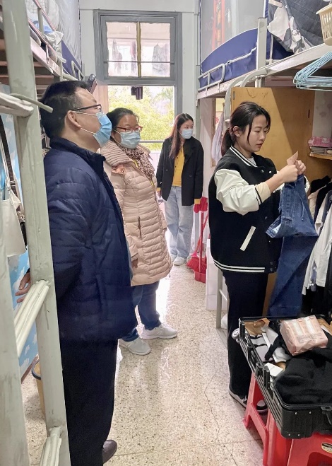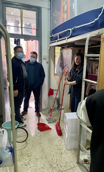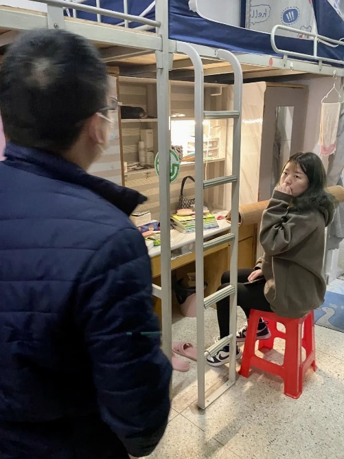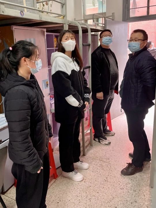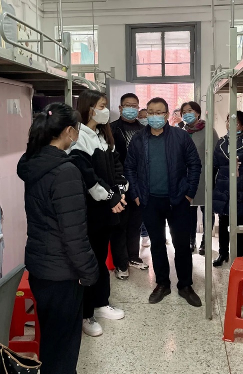 郭仲先校长助理细心叮嘱同学们在疫情防控期间的注意事项,耐心倾听同学们的诉求,仔细了解学生返校后的心理状态,并表示希望同学们尽快调整生活状态,在学好专业知识的同时,也要高度重视校园疫情防控问题,宿舍要按时清洁、通风,做好一日三检,注重防护,加强锻炼,养成良好生活习惯,保持积极乐观的心态面对疫情下的学习、就业、升学,出现意外情况及时联系辅导员老师,共同做好校园疫情防控工作。