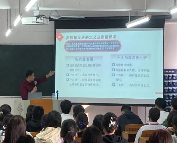 雷毅雄院长从党和国家过去5年和新时代10年伟大变革中,结合自身感受,深入解读了党的二十大精神、高质量发展的定义及衡量标准,深刻阐述高质量发展作为全面建设社会主义现代化国家首要任务的重大意义。随后,针对如何实现高质量发展,雷毅雄院长从从市场机制、财政政策、科技创新等方面详细介绍了二十大报告的相关内容。最后,雷毅雄院长指出,作为大学生,推进高质量的发展就是如何提高自己的全面发展,并对同学们在提高自身全面发展上提出了几点要求:一要树立正确的人生观;二要树立正确的价值观;三要坚持做好修身养性;四要积极重视身体锻炼;五要坚持自力自强。雷院的谆谆话语,殷殷嘱托,激发了同学们为目标不懈奋斗的澎湃力量。