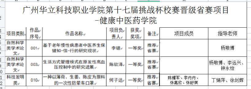 2023年3月22日,广州华立科技职业学院组织开展了“第十七届挑战杯”大学生课外学术科技作品竞赛,健康/中医药学院老师杨敬博老师、李远兴老师、钟永怡老师、丁娟萍老师、徐剑辉老师指导三个项目参赛,全部获得校赛一等奖推荐进入参加省赛。