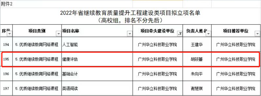 根据《广东省教育厅关于开展2022年省继续教育质量提升工程建设类项目申报工作的通知》等文件要求,经地级以上市教育局和高校推荐、资格审查、专家评分等环节,广东省教育厅公布了2022年广东继续教育质量提升工程建设类项目拟立项名单,共评出立项项目773个。我院《健康评估》课程喜获立项优质继续教育网络课程。