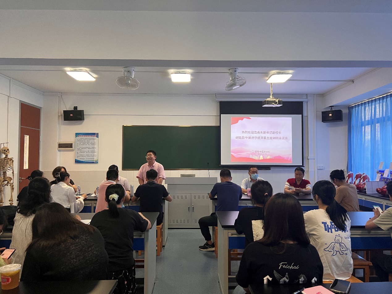 健康学院院长雷毅雄,直属党支部书记、副院长孟允煌,中医药学院直属党支部书记、副院长曾祥彪,副院长张志勇以及学院的相关负责人、教师代表、辅导员、学生代表参加座谈交流。