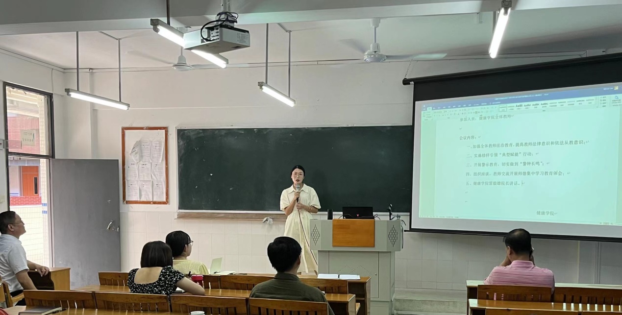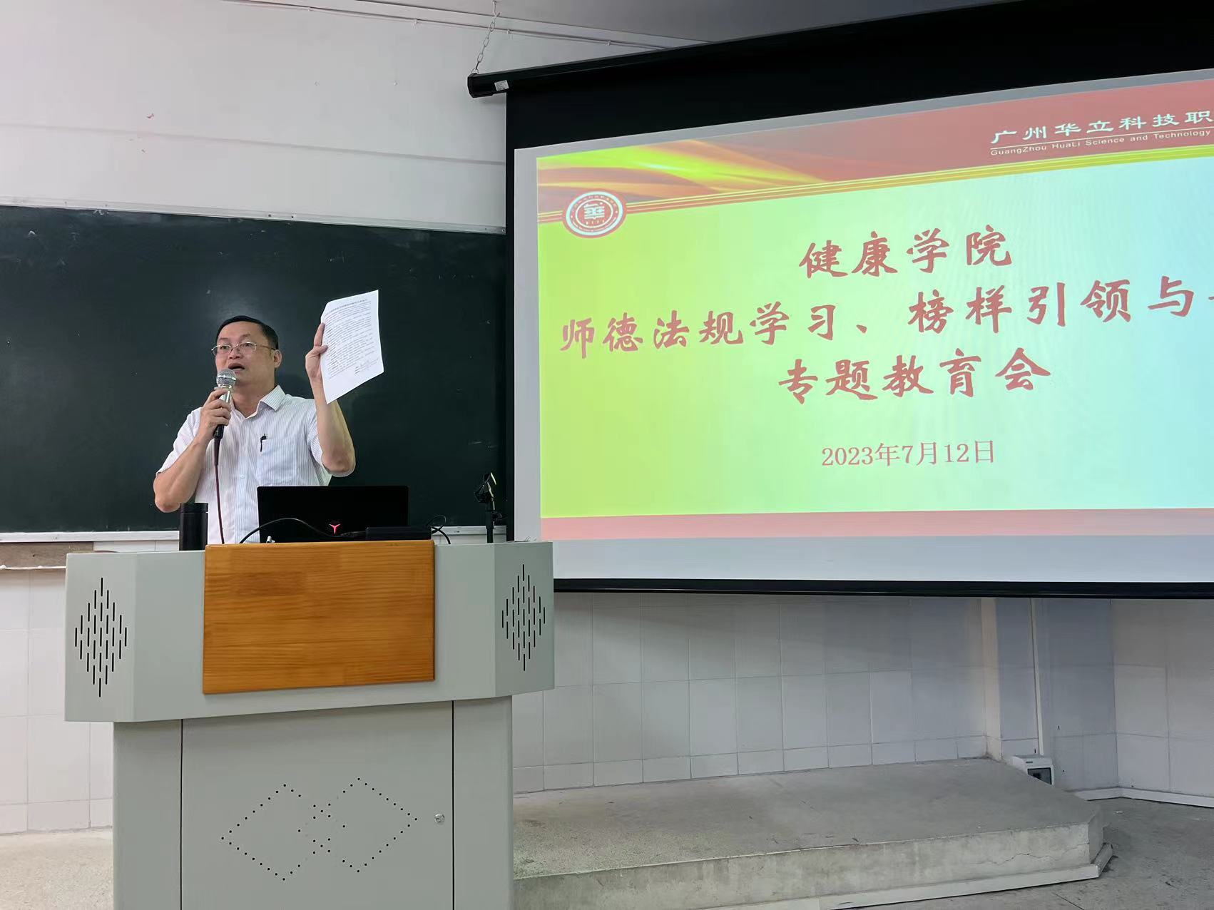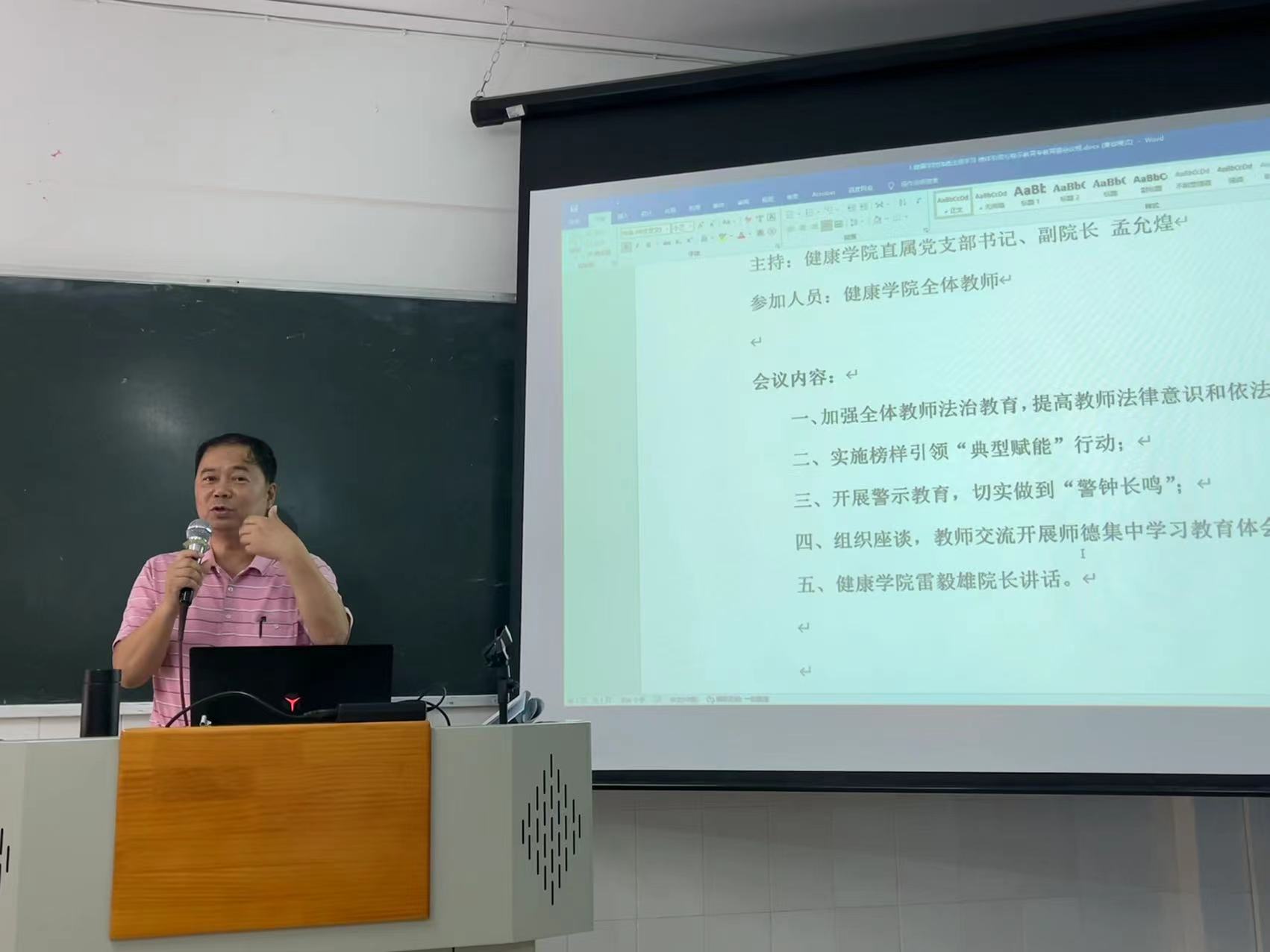 在组织学院全体教师举行师德集中学习教育动员会后,为进一步把德师风建设引向深入,2023年7月12日下午,健康学院再次组织学院全体教师在西2-201会议室举行师德法规学习、榜样引领与警示教育专题教育会。会议由学院直属党支部书记、副院长孟允煌主持,院长雷毅雄对本次师德集中学习教育作总结发言。