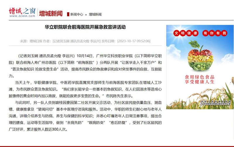 记者刘玉娴 通讯员孟允煌 李远兴)10月14日,广州华立科技职业学院(以下简称华立职院)联合前海人寿广州总医院(以下简称“前海医院”)分两队开展“让医学走入千家万户”和“普及急救知识 抢救宝贵生命”活动,提高市民群众的急救意识和应对突发事件的自救、互救能力。