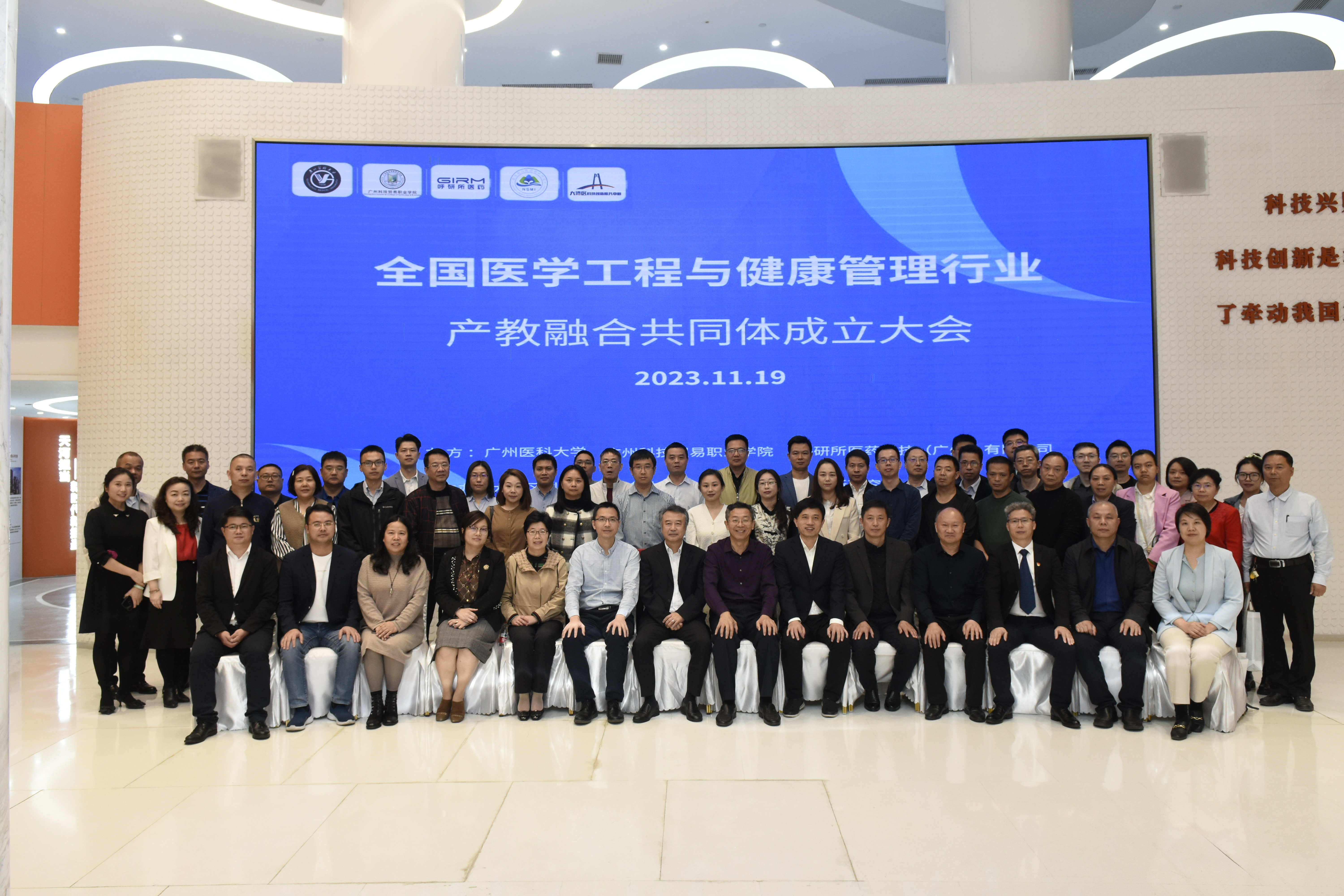 大会还审议通过了“共同体”《广州共识》,进行了主题报告和交流。会议上,共同体各成员单位和相关部门就如何贯彻落实党的二十大精神,深化现代职业教育体系建设改革,坚持以教促产、以产助教,产教融合、产学合作,推进我国职业教育高质量发展等方面进行了广泛的交流。最后,“全国医学工程与健康管理行业产教融合共同体”宣布成立,理事长单位和副理事长单位分别上台作了发言。会后全体与会单位和代表合影留念,并参观考察了广州(国际)科技成果转化天河基地。