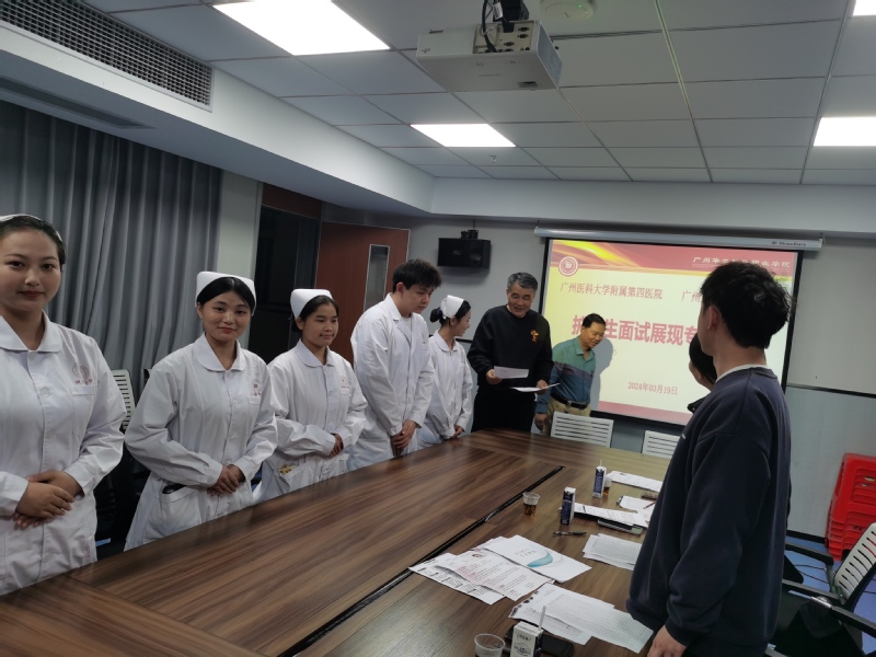 2024年3月19日,为强化校企合作,邀请广医四医院护理部主任陈彩青一行9人,前来健康与护理学院护理学系面试实习生。本次面试陈德清校长亲临指导,学院院长、校外联系人、实训中心、辅导员、护理学系教师团结协作保证面试有序进行。